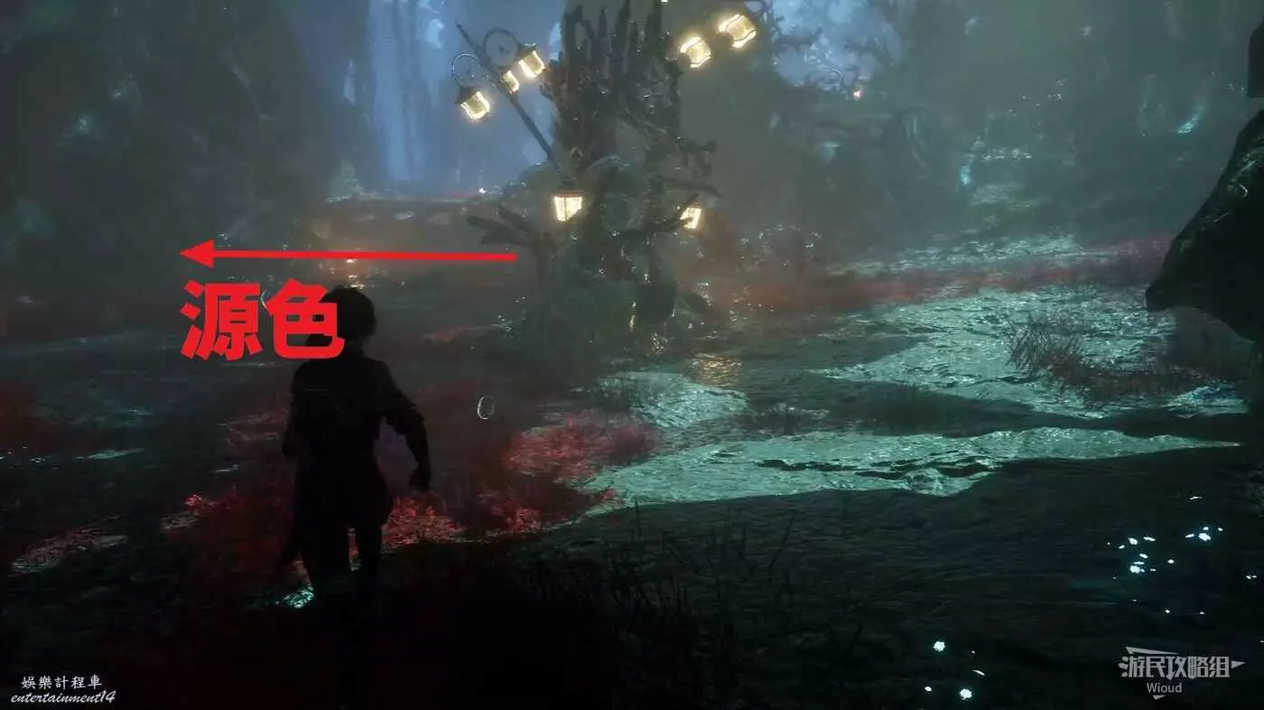 經過燈籠海藻樹,貼著左牆走到一個過道,走進去立即左拐,盡頭可以找到符紋【回報標記】,回到過道門口進去右拐可以拿到一個【靈光色】。