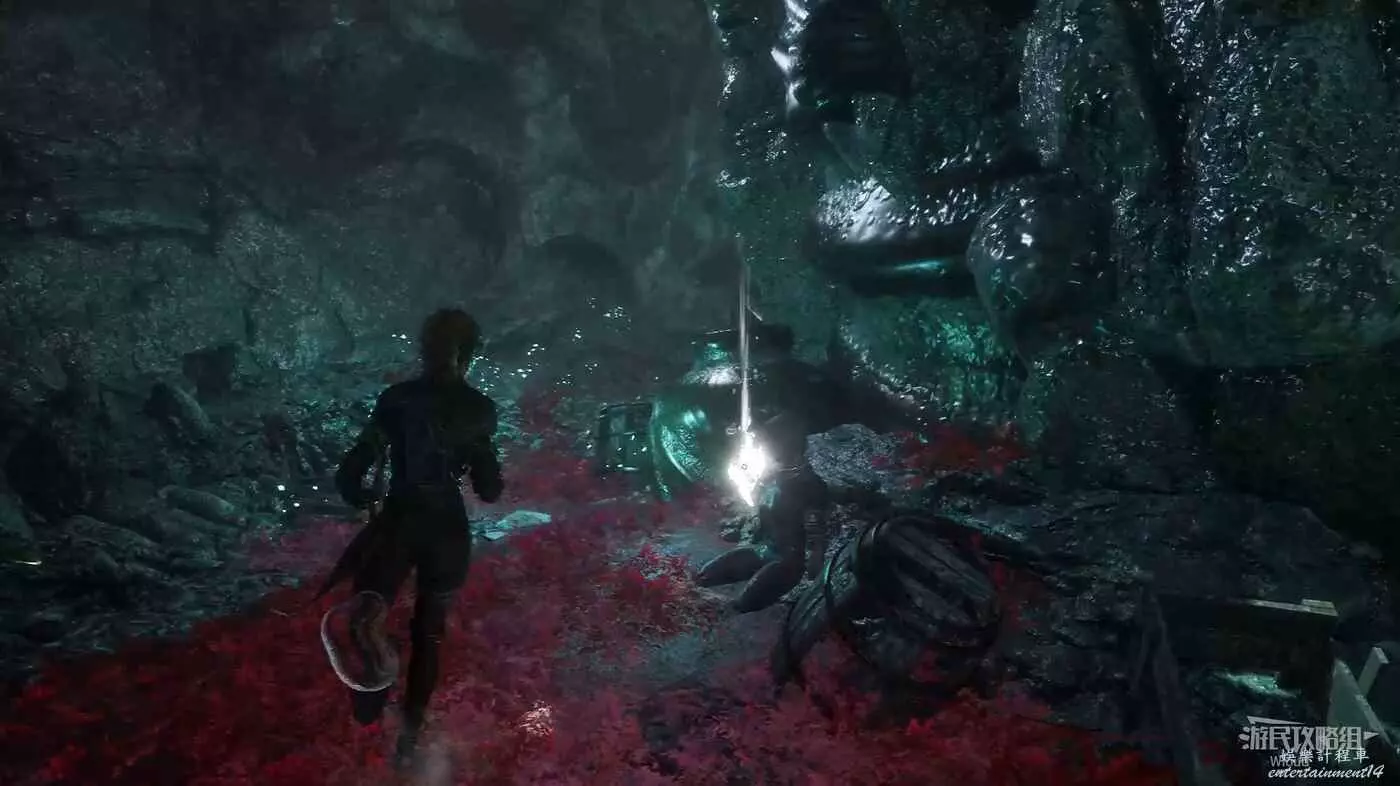 走到開闊區域,擊敗前方右側的經怪可獲得武器【鰭刺】。