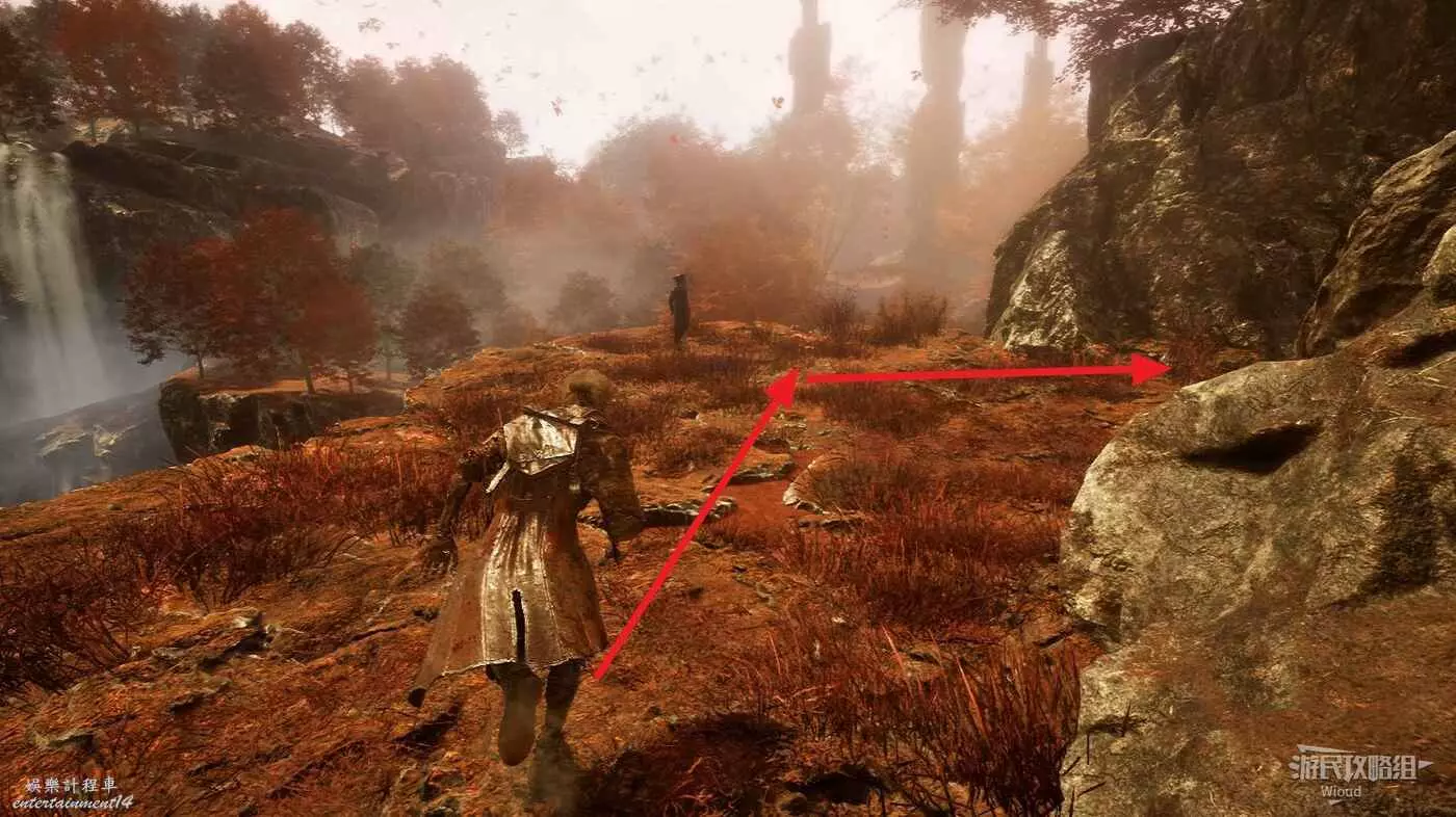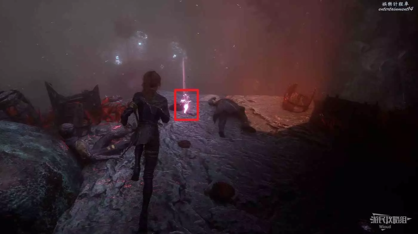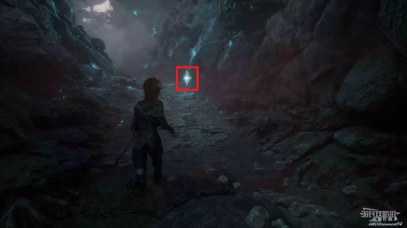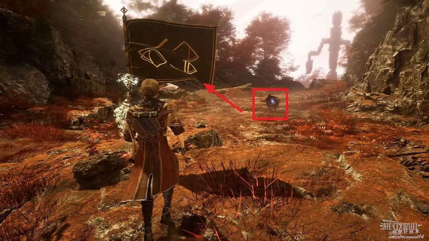 繼續走,啟動第二個遠征隊旗幟,旗幟位置貼著右牆繼續走,右側散發藍光的位置可以撿到符紋【踉蹌攻擊】。