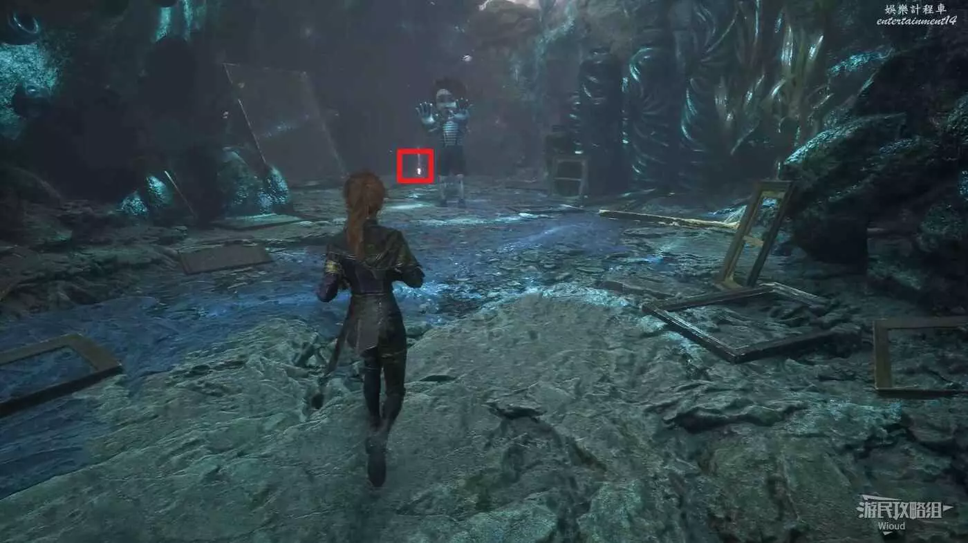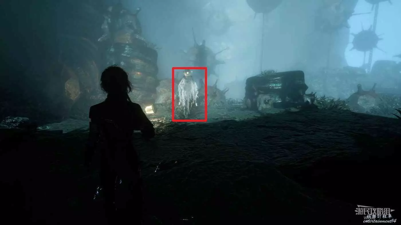 往左側水藻過道走到盡頭,爬樓梯上去找到一個默偶,將其擊敗獲得瑪埃爾的短髮裝束,默偶後方道具點可拿一個【靈光色】。