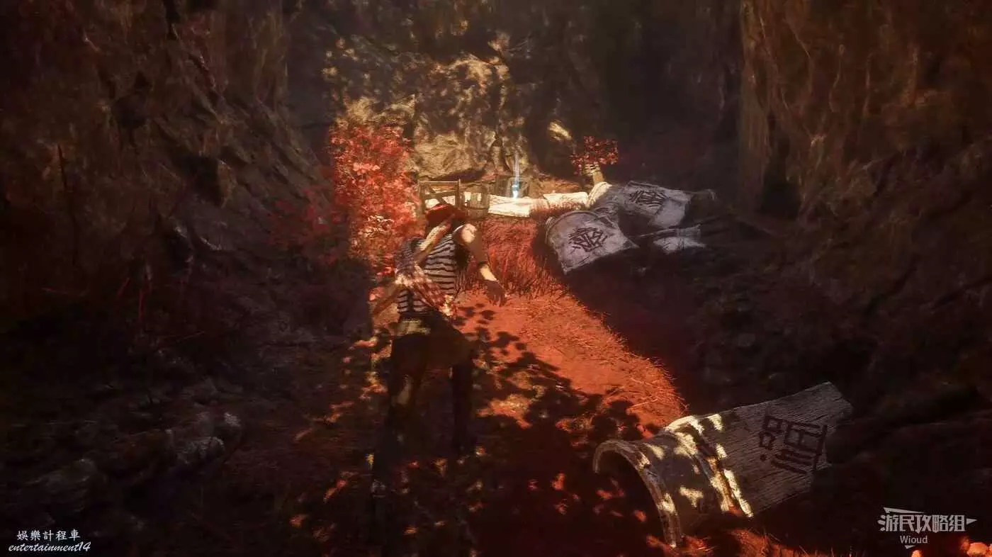 走出通道先往右走,右側盡頭有個被木桶擋住的光點,破壞木桶拾取光點獲得符紋【死亡精力·二】。
