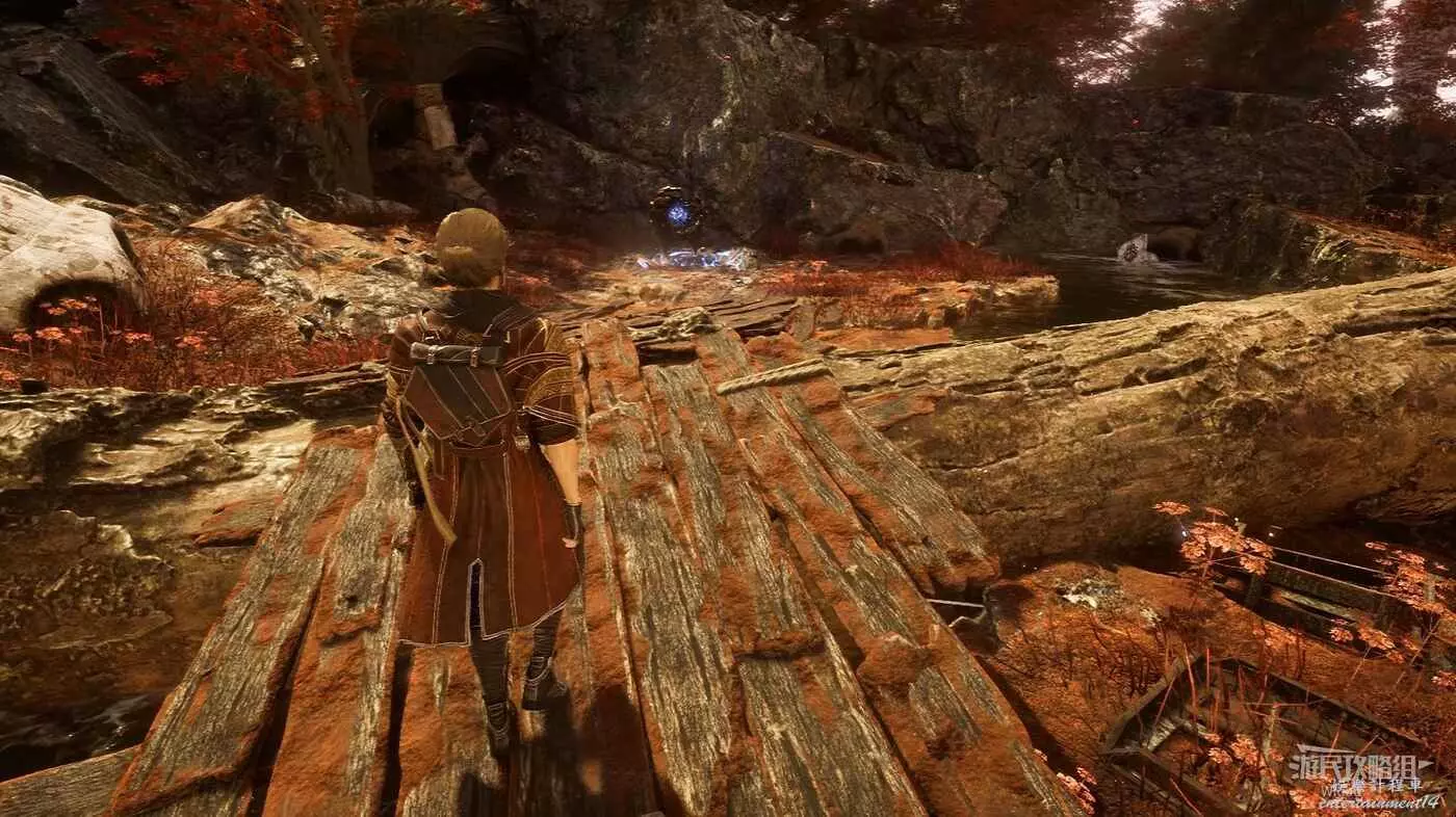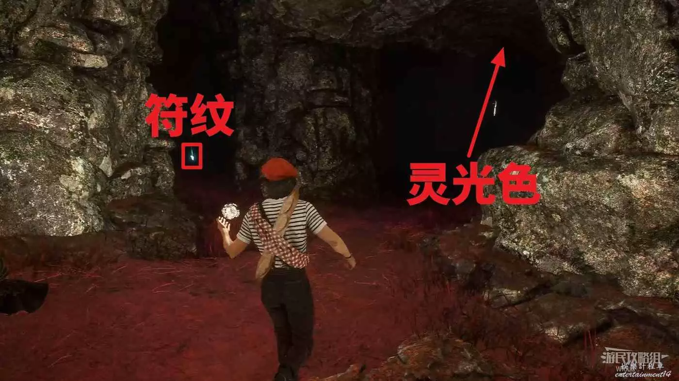 主路走到前方岔路口,先走左側下坡,盡頭爬機關到底部平臺,拾取發光道具點可獲得符紋【引燃標記】。