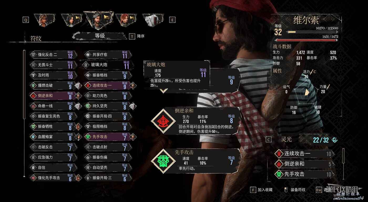每個角色可以裝備三個不同的符紋,每個符紋都有不同效果,遊戲裡沒有重複的符紋,當出現了兩個角色都需要同一種符紋的時候,本作的靈光機制就顯得很有用了。