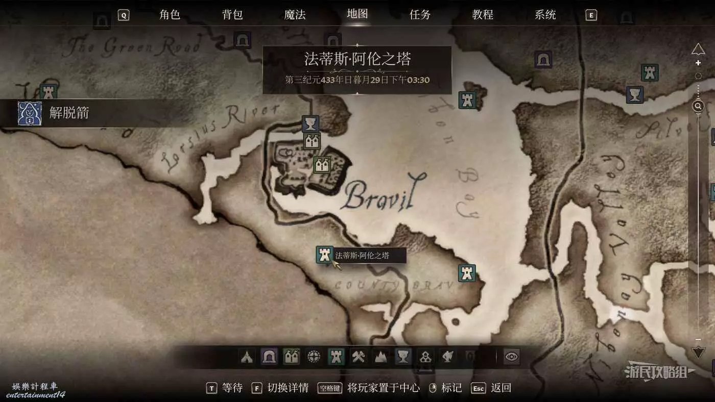 進入暗道後,在此區域中遇到的敵人可以隨意擊殺,到達水域後有一處較深的地方是可以潛水的,潛入水下緊貼左側牆壁往前遊,在必須繞過的第一塊大石頭下方有一條通道,繼續沿著這條路往前走就能到達布拉維爾巫師巢穴,開鎖進入,繼續沿著標記前進,途中的敵人可以都殺掉,直到到達通往法蒂斯·阿倫之塔的巨大之門。