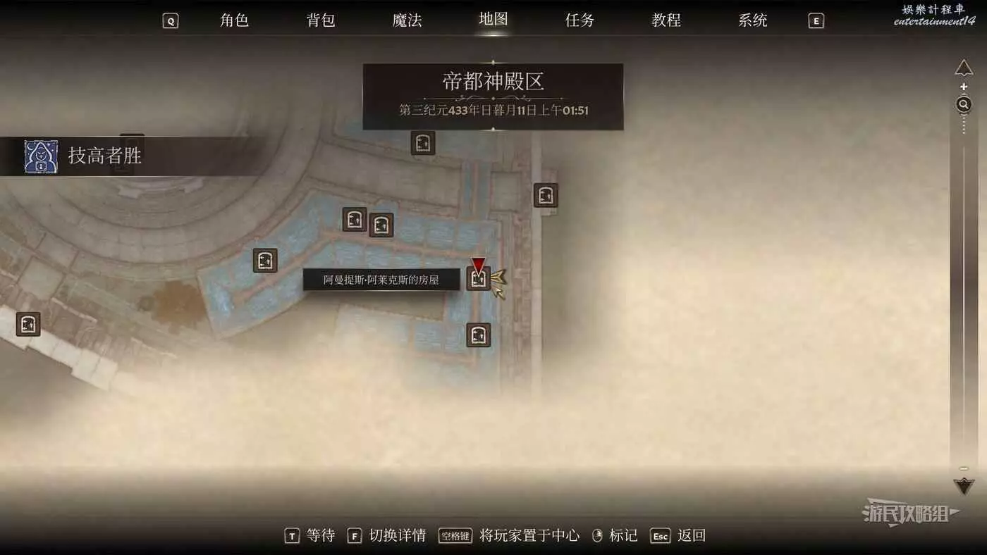 之後解鎖一個任務【技高者勝】,在任務介面追蹤並打開地圖查看標記位置,第一個標記就在接取任務的地方有個睡覺的乞丐【瘦弱的安庫斯】,與他交談選擇【阿曼提斯·阿萊克斯】→【這是五個硬幣】,即可解鎖下一個標記點。