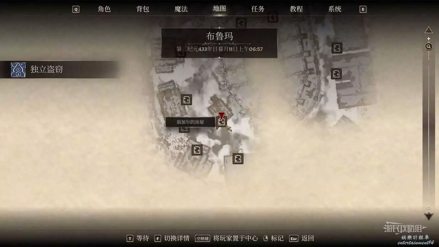 前往布拉維爾城堡,在早晨8點左右進入【領主莊園北翼】,然後打開左側木門進入法蒂斯·阿倫的房間,房間裡有兩個上鎖的木箱,搜刮之後發現目標道具不在箱子裡,會更新下一個目標。回到這個房間的門口,面對房間裡,在門正對的牆上右側有可動柱子,與可動柱子互動打開暗道。