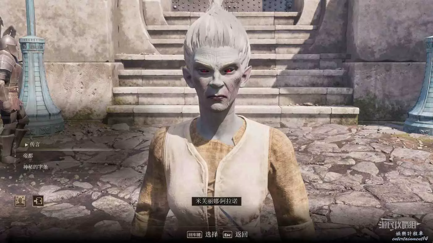 【視而不見】需要在帝都室外等著直到梅斯雷德爾主動觸發對話(直接用等待功能在以1小時為單位跳過時間即可),選擇【上面寫著什麼】。然後跟隨標記前往布魯瑪東大門-赫爾維烏斯·塞西婭的房屋,與灰狐交談並選擇【很榮幸終於見到你了】→【榮幸之至】。