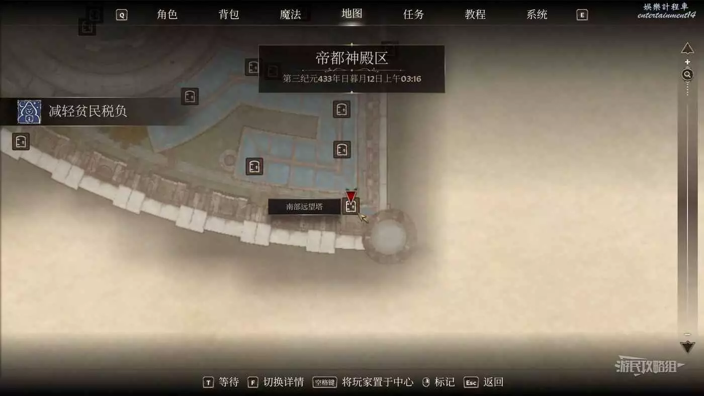 【減輕貧民稅負】需要偷回稅務記錄,跟隨標記傳送到帝都神殿區南部遠望塔,等到晚上12點,大部分守衛都會離開,爬2次梯子到東南部哨崗兵營-南部哨崗兵營。然後繼續爬梯子前往南部巡衛隊長的居室(需要開鎖),進屋後右轉開鎖書桌即可拿到【濱水區納稅記錄】。注意兵營裡也有許多裝備可以拿,可以順便偷走以便解鎖後續任務。原路返回與阿曼德對話即可完成任務。