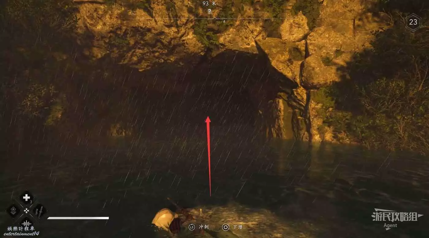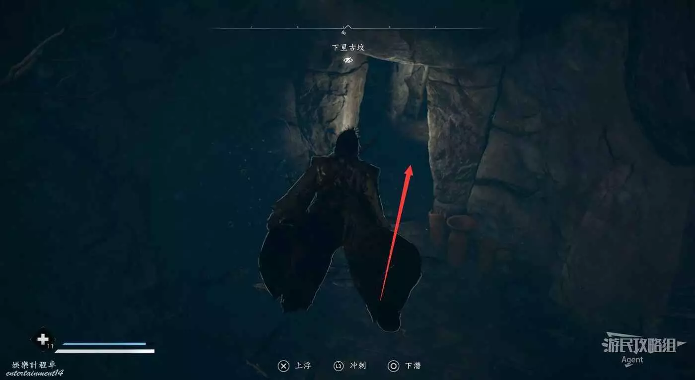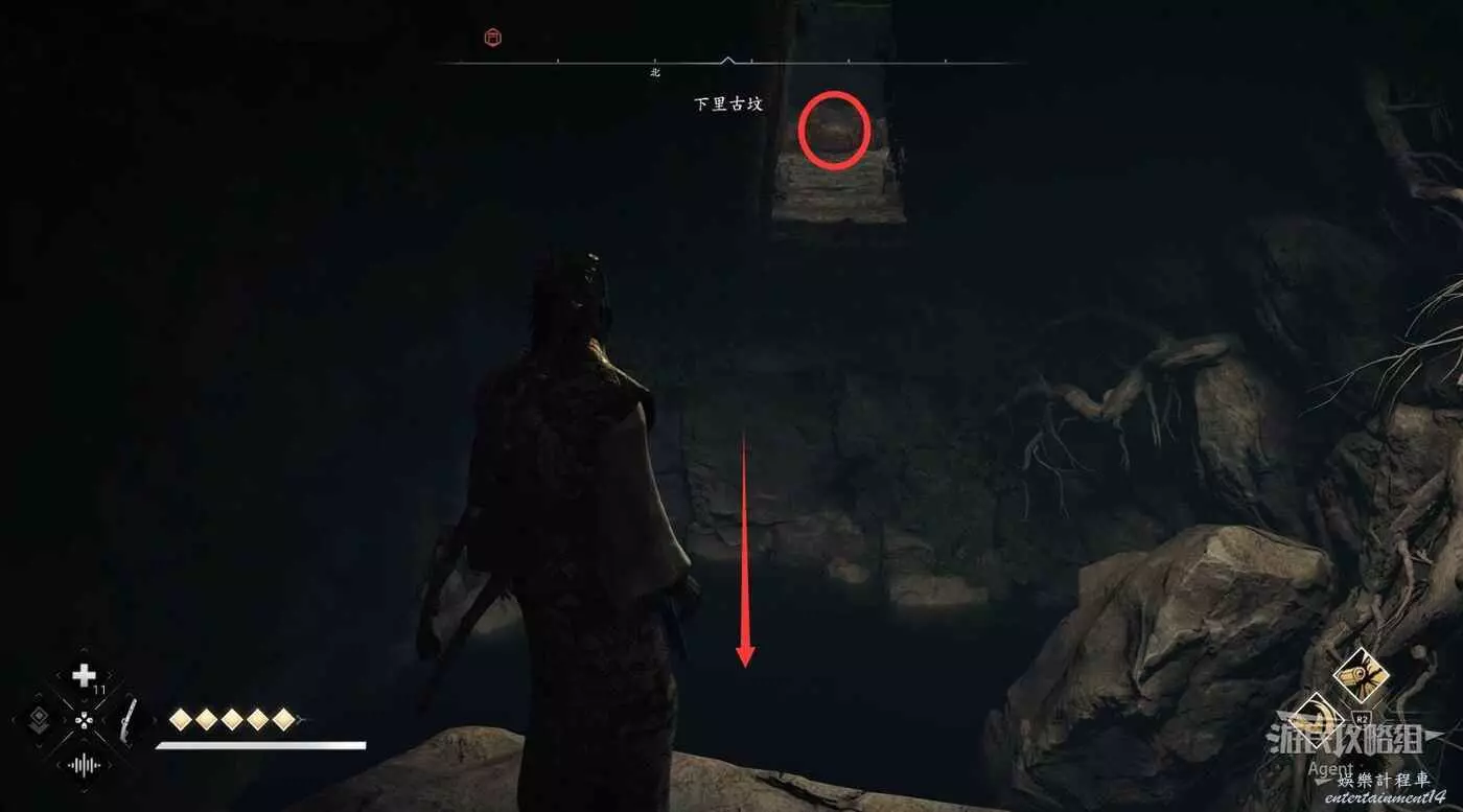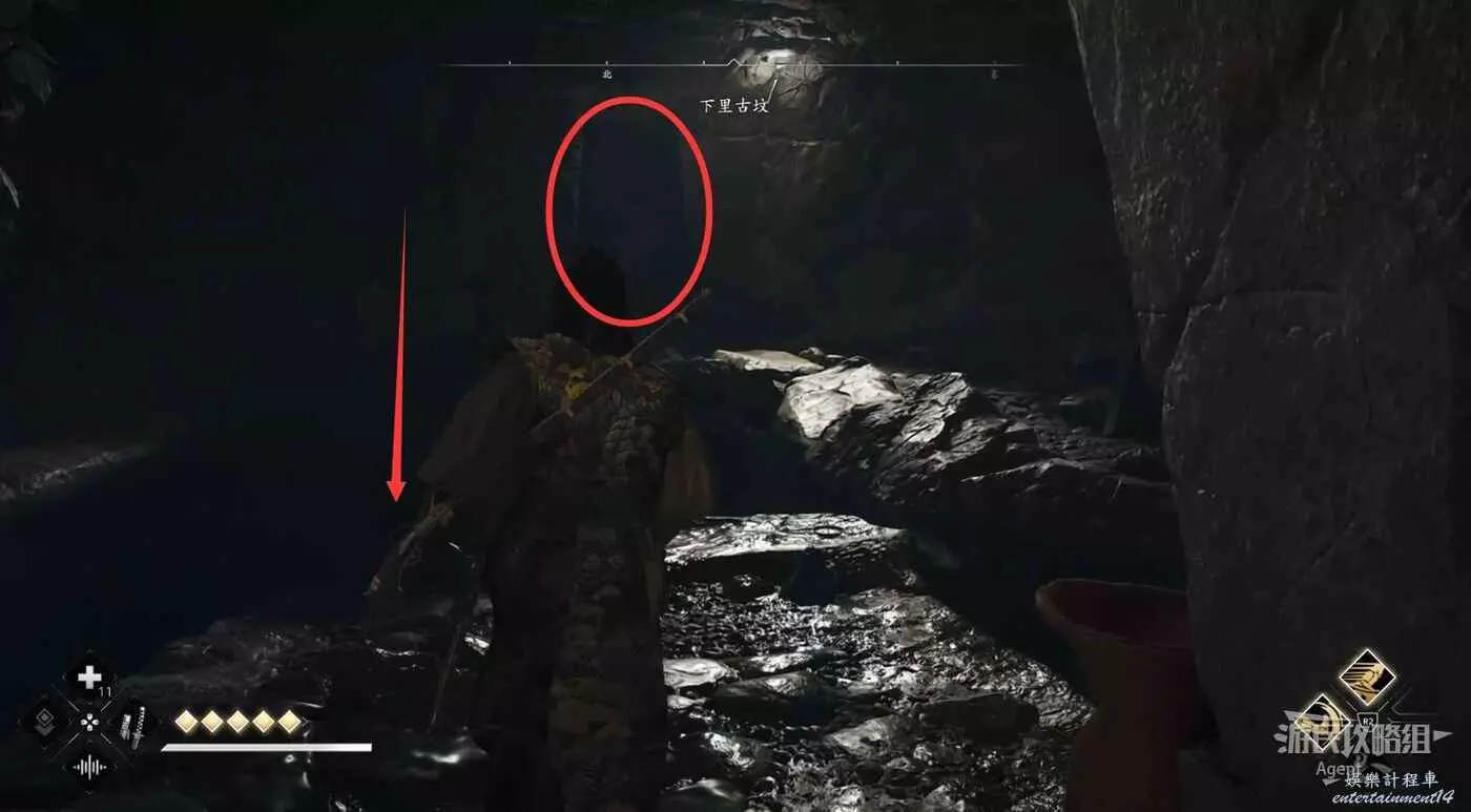 水池對面的路走到頭,從洞口可以看到傳奇寶箱,但暫時還拿不到。