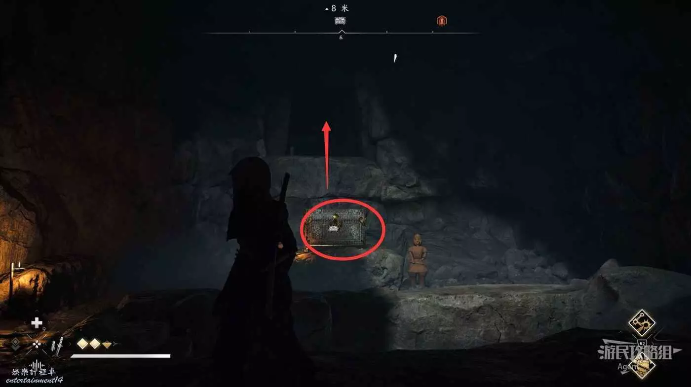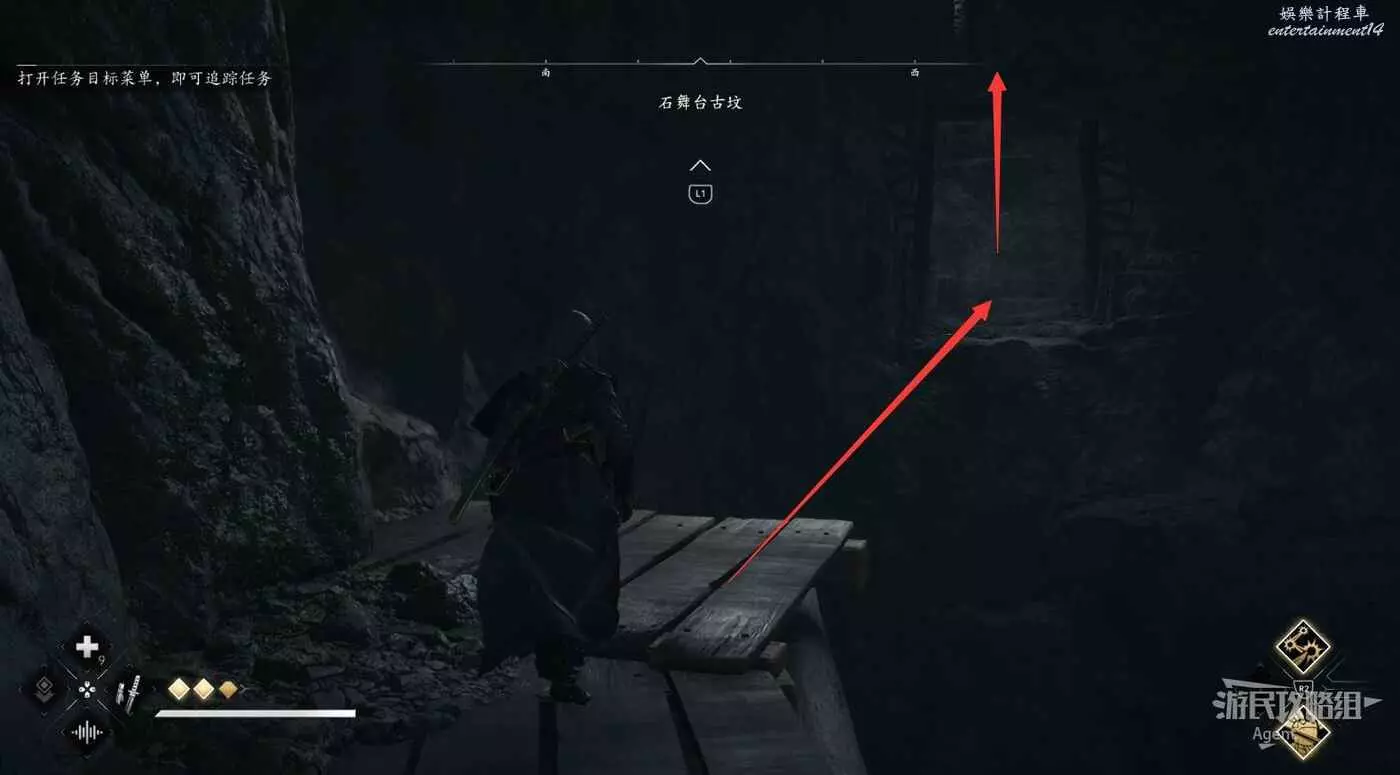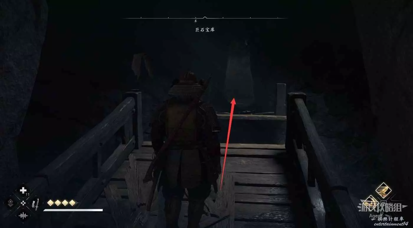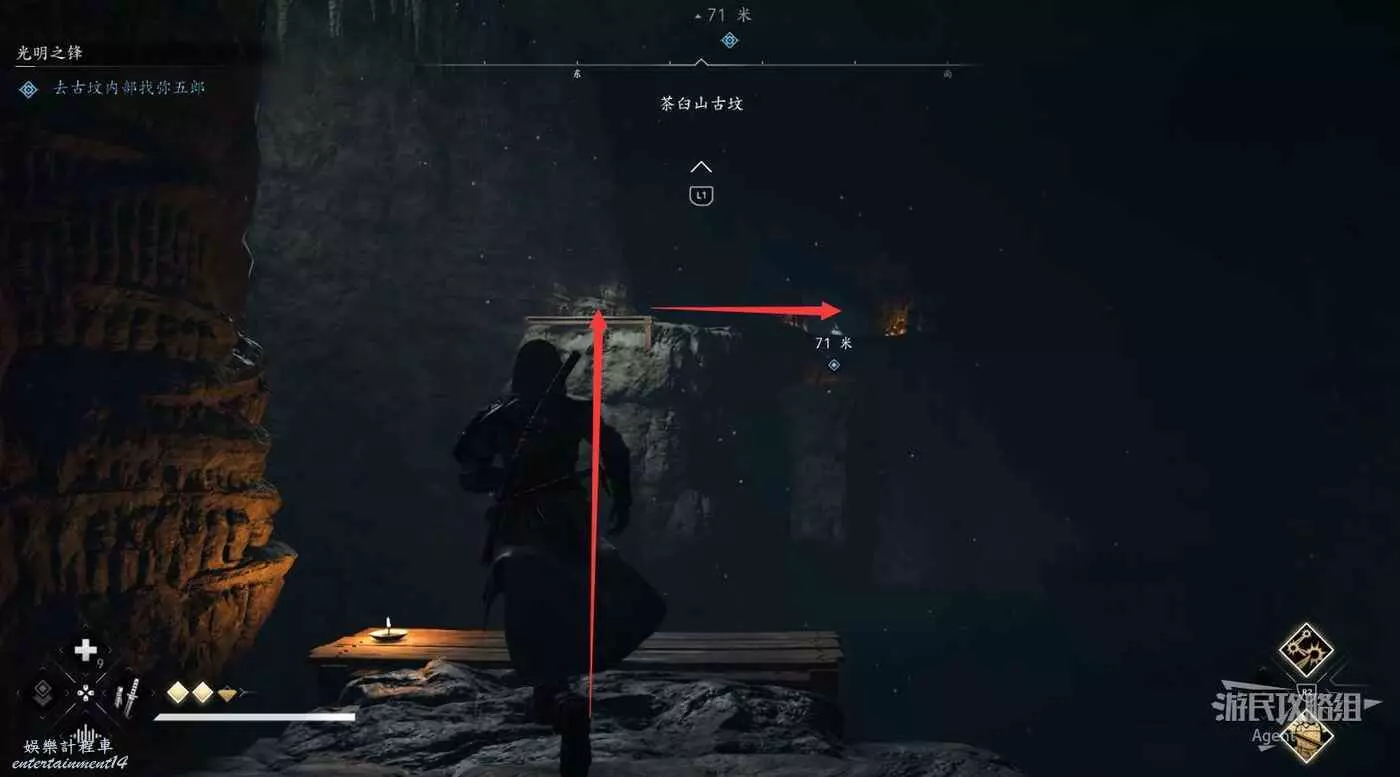 來到下圖位置,先去右邊鑽進狹縫拿個小寶箱,然後再用鉤繩跳到對面。
