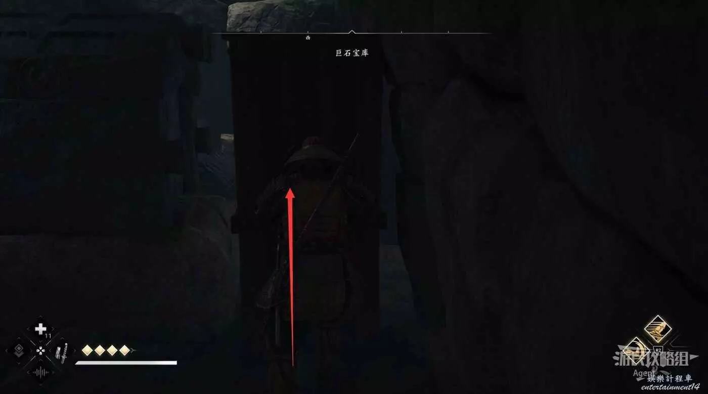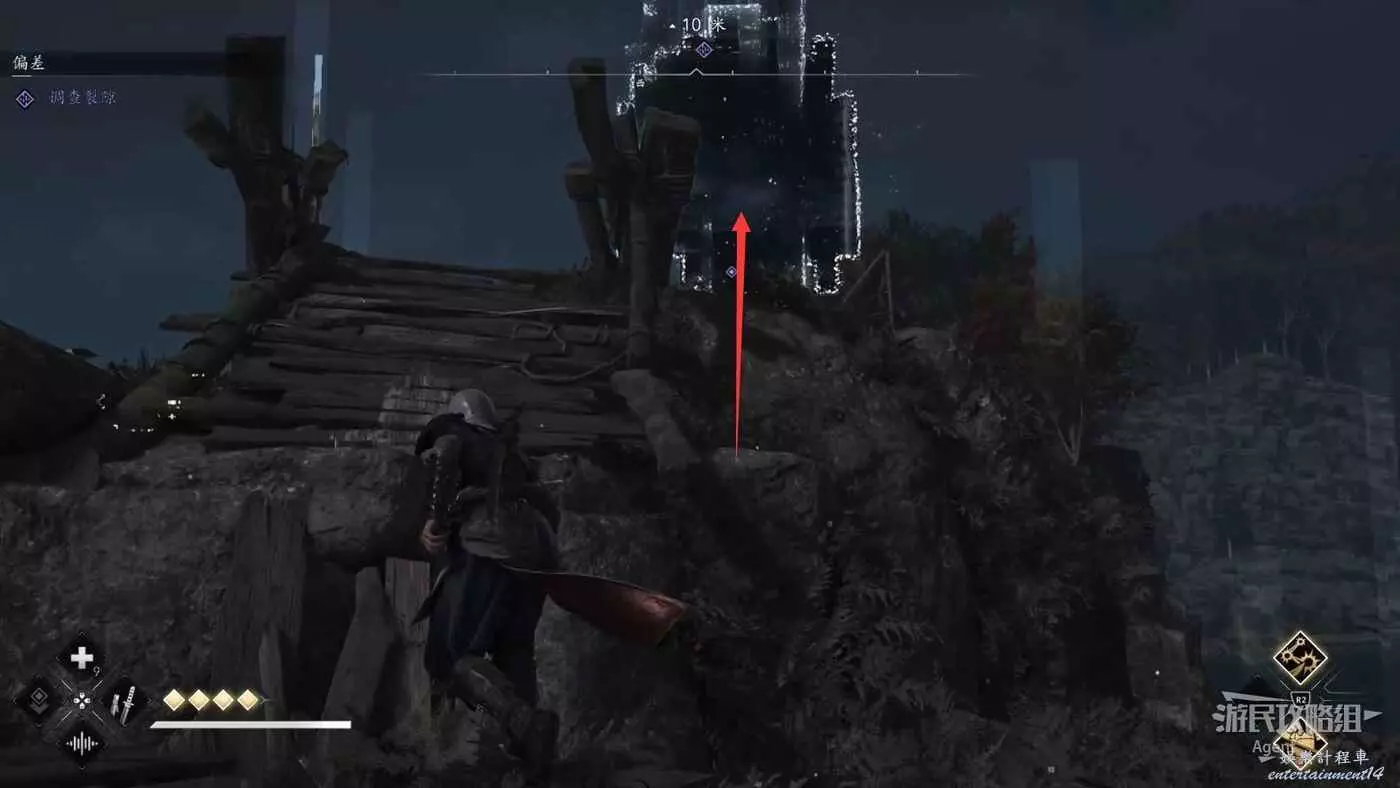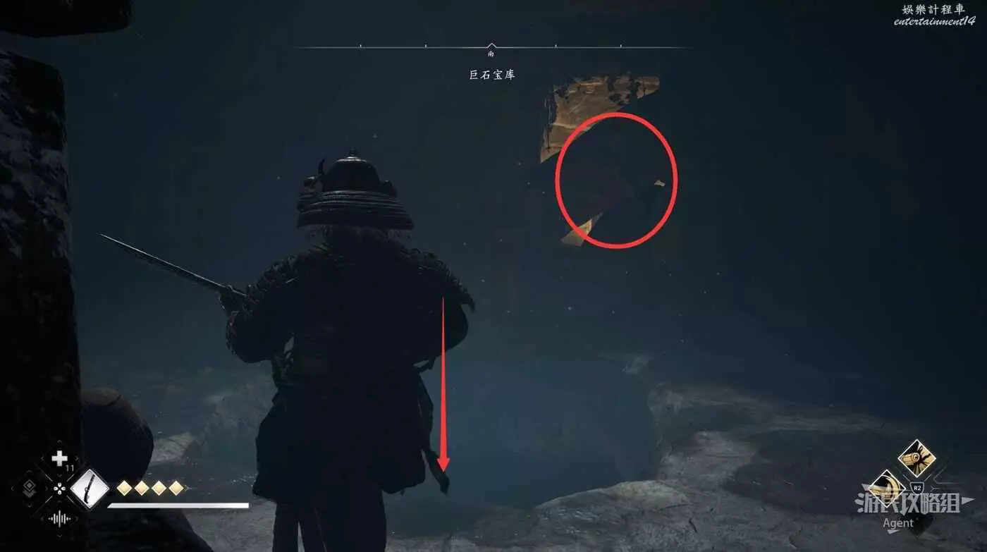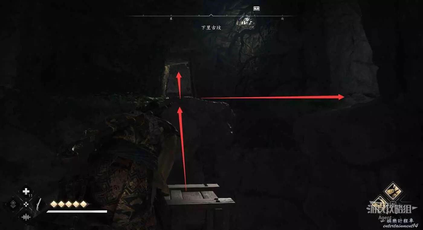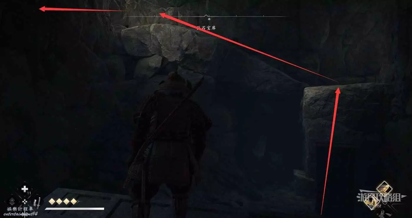 來到下圖位置,先去右邊鑽進狹縫拿個小寶箱,然後再用鉤繩跳到對面。