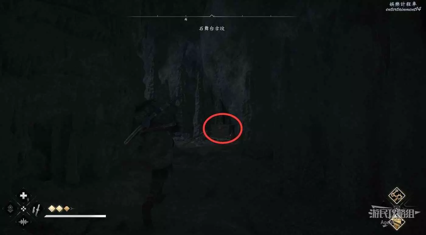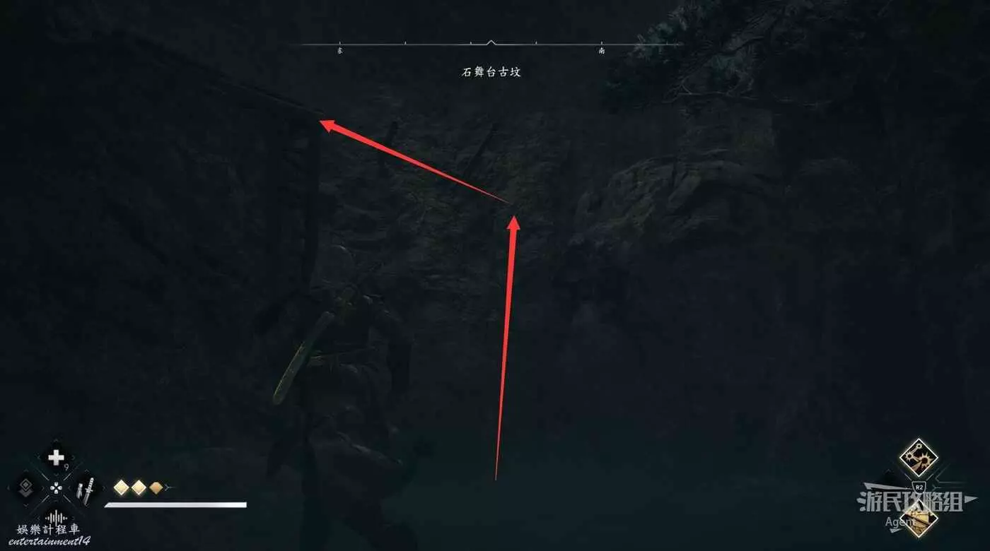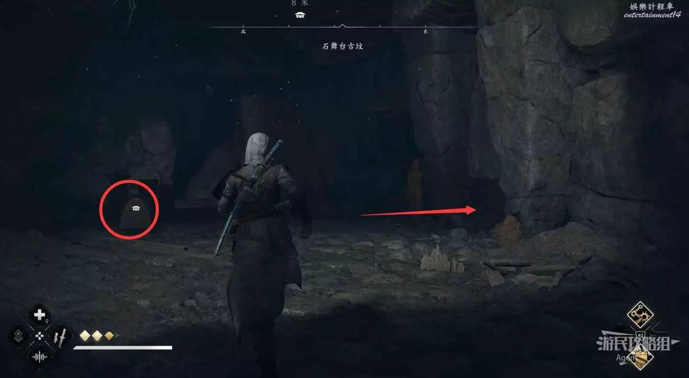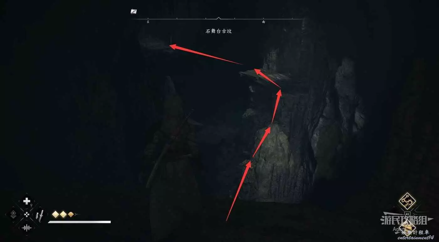 來到下圖位置,先去右邊鑽進狹縫拿個小寶箱,然後再用鉤繩跳到對面。