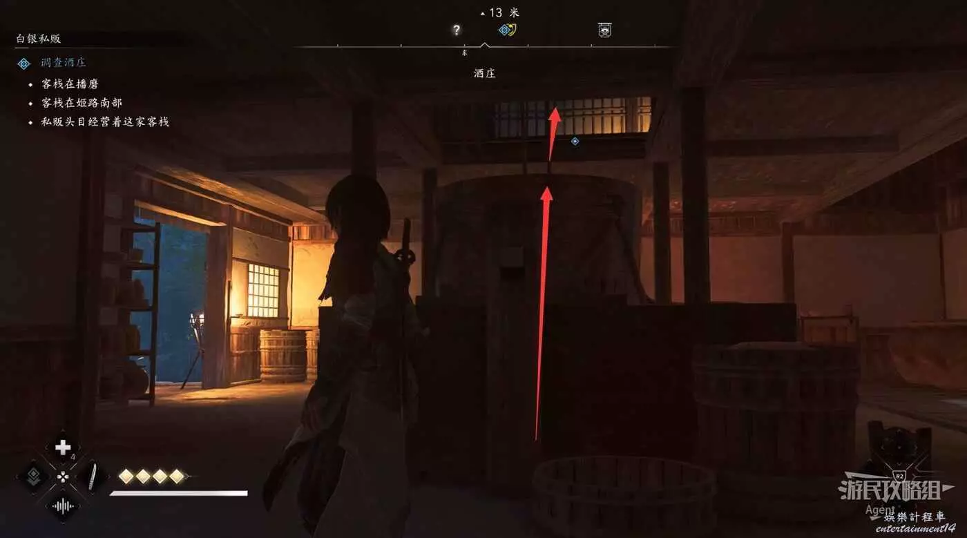 在酒莊調查私販頭目時,需要從大酒缸爬上去。有點難爬,需要多試試。