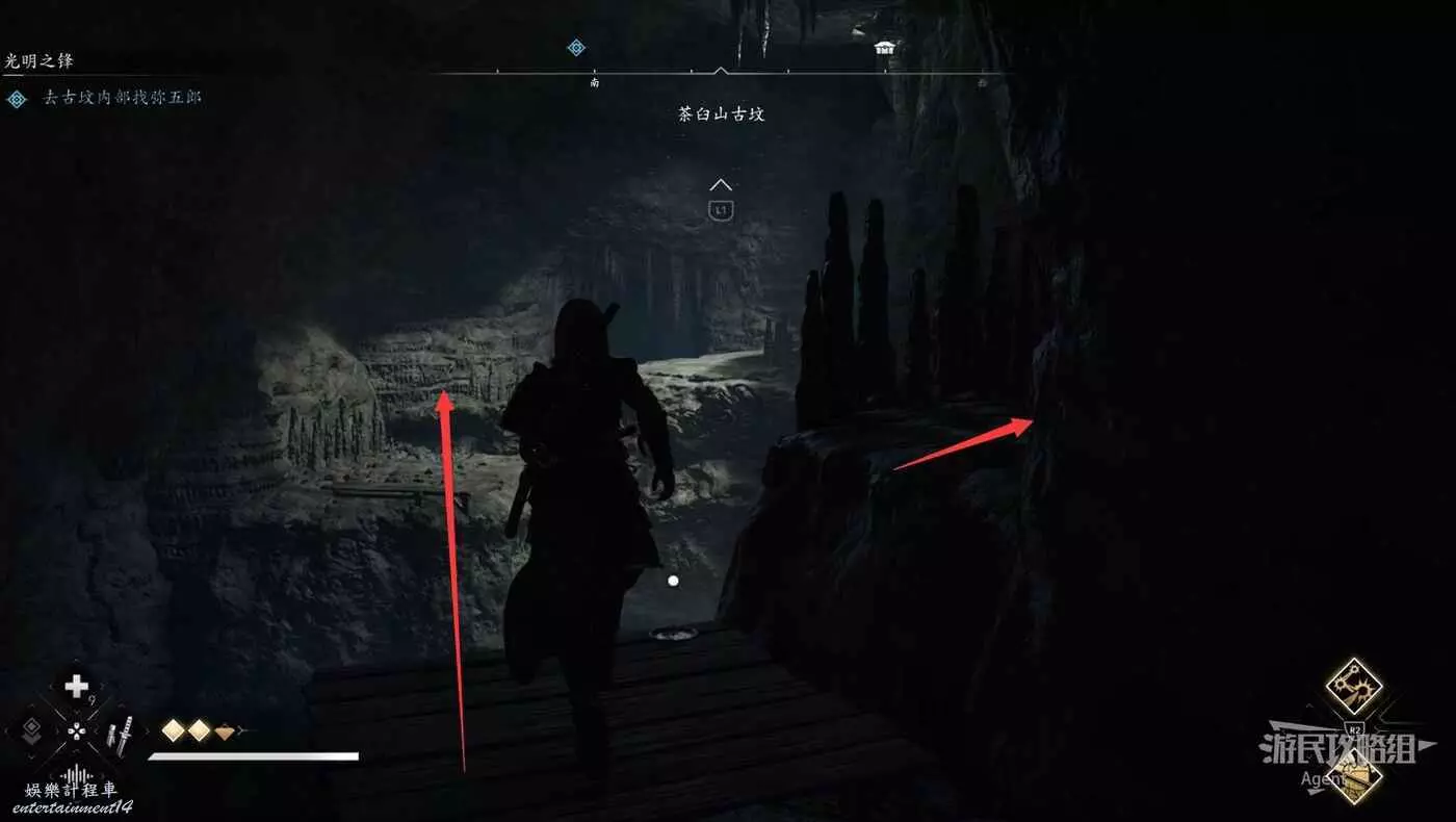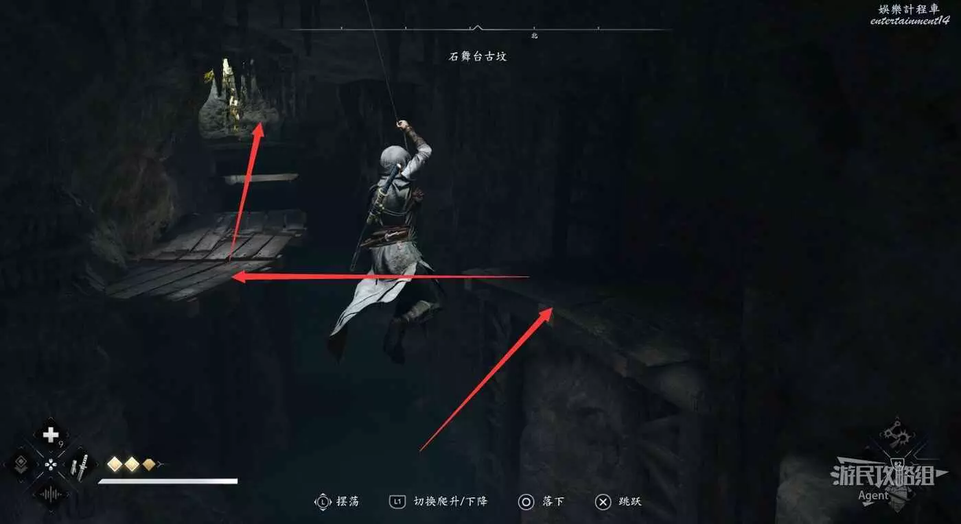 繼續往前走,用鉤繩跳到對面牆上,然後往左爬。