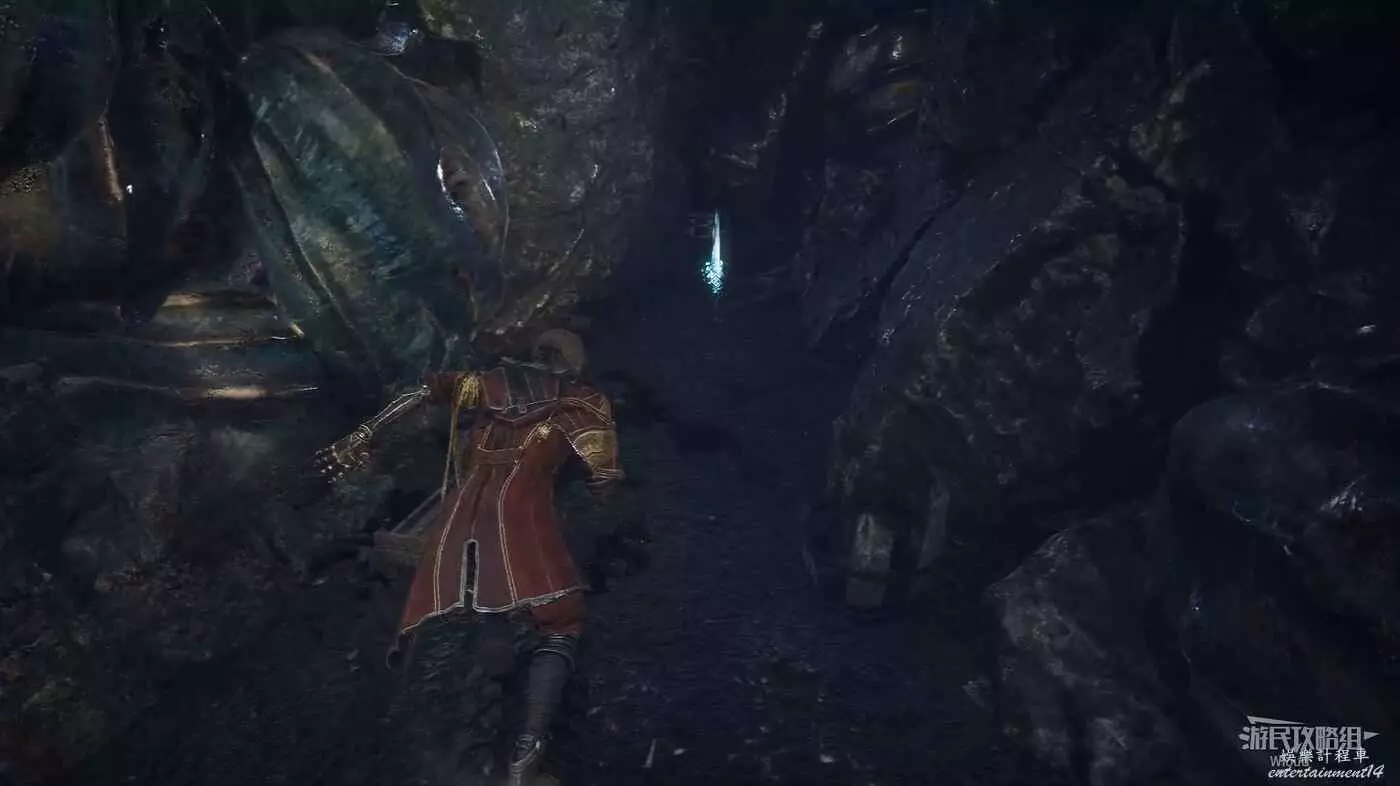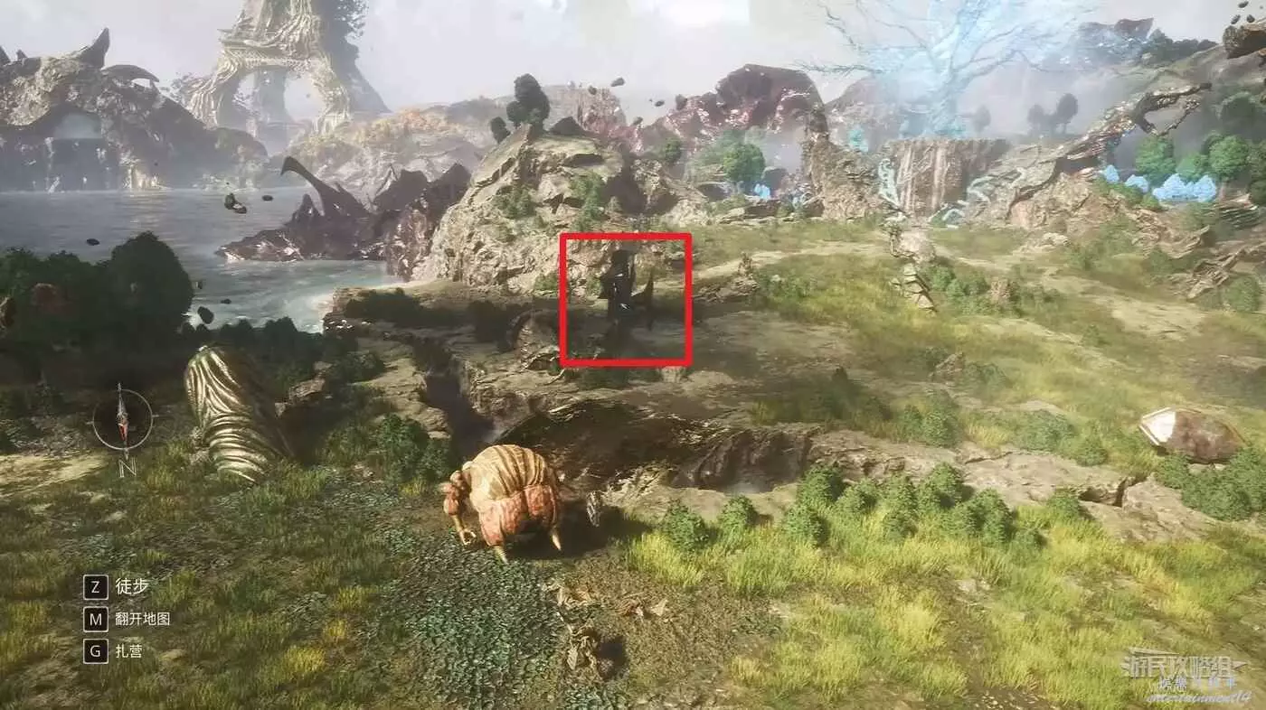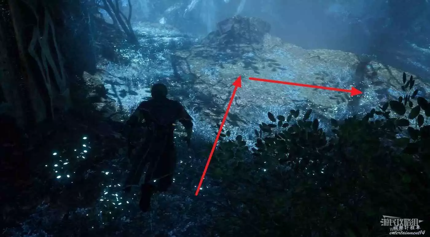 無視這隻經怪,啟動左側的篝火,沿旁邊的藍色通道走到裡面的開闊區域。