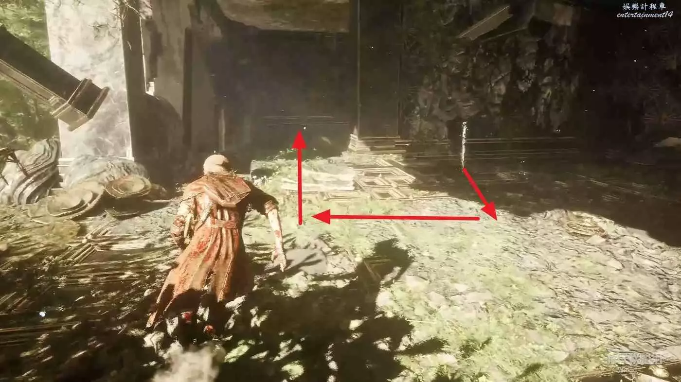 走出通道先往右走,右側盡頭有個被木桶擋住的光點,破壞木桶拾取光點獲得符紋【死亡精力·二】。