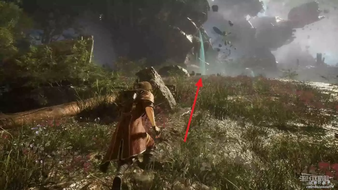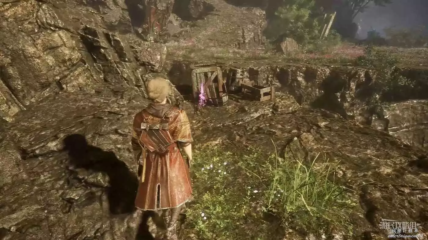 回到打BOSS的位置,從出口來到大地圖,往左走,經過一個名為修士洞穴的桃色森林,前方被箱子擋住的道具點可以拾取一個【靈光色】。