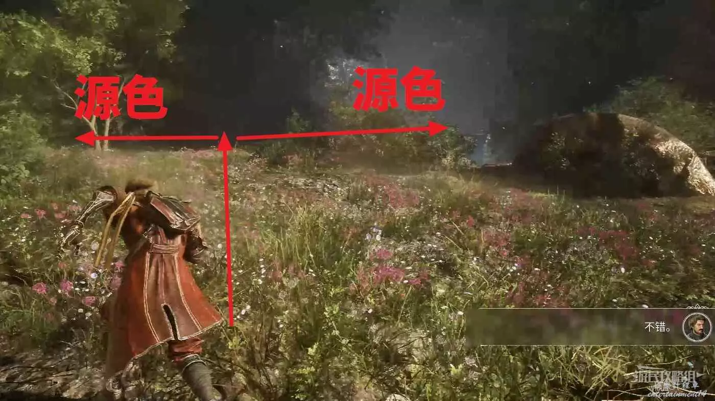 回到篝火處往右走,不遠處有個大塊頭敵人,敵人右側樹下可以撿到一個【靈光色】。