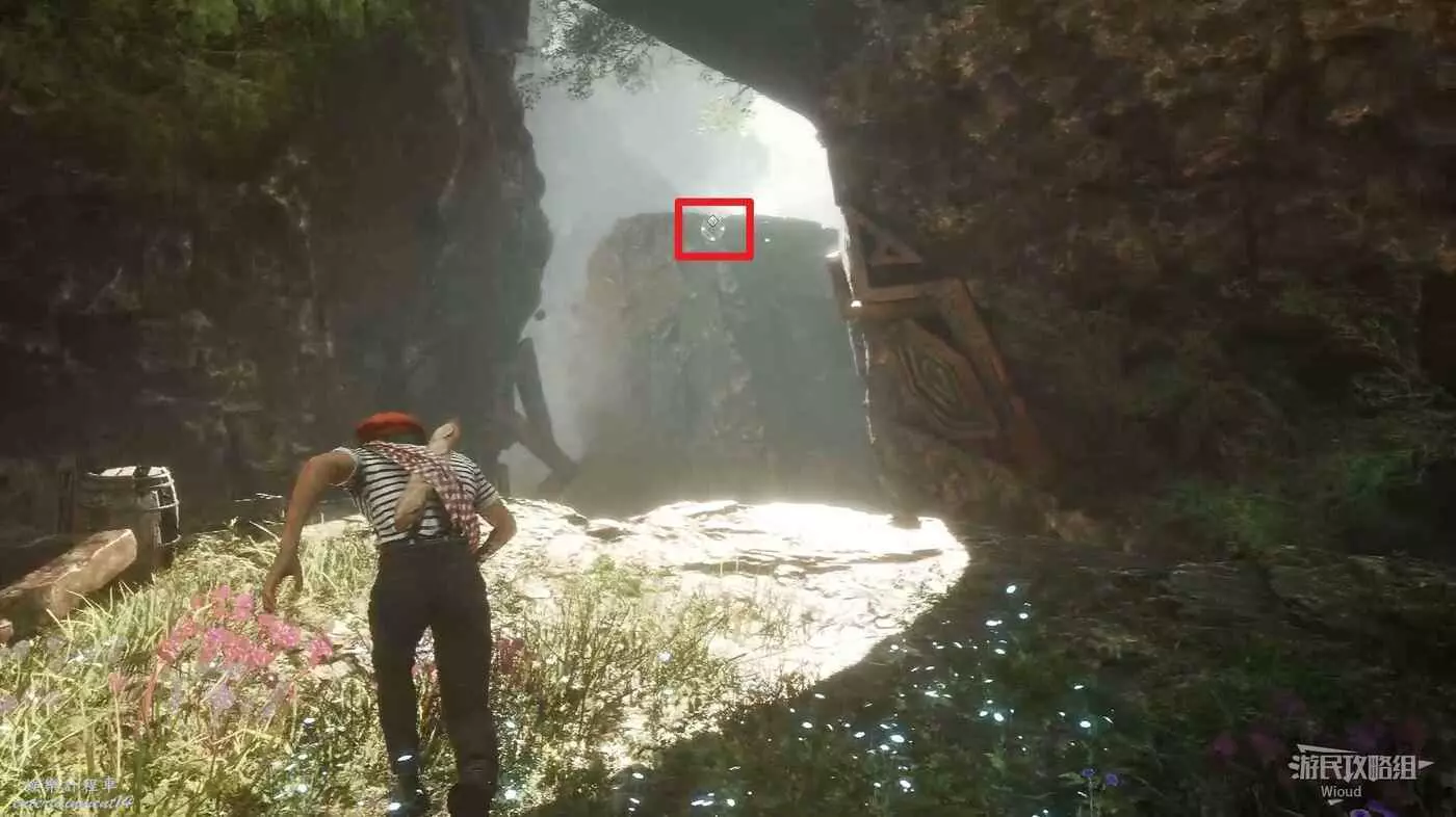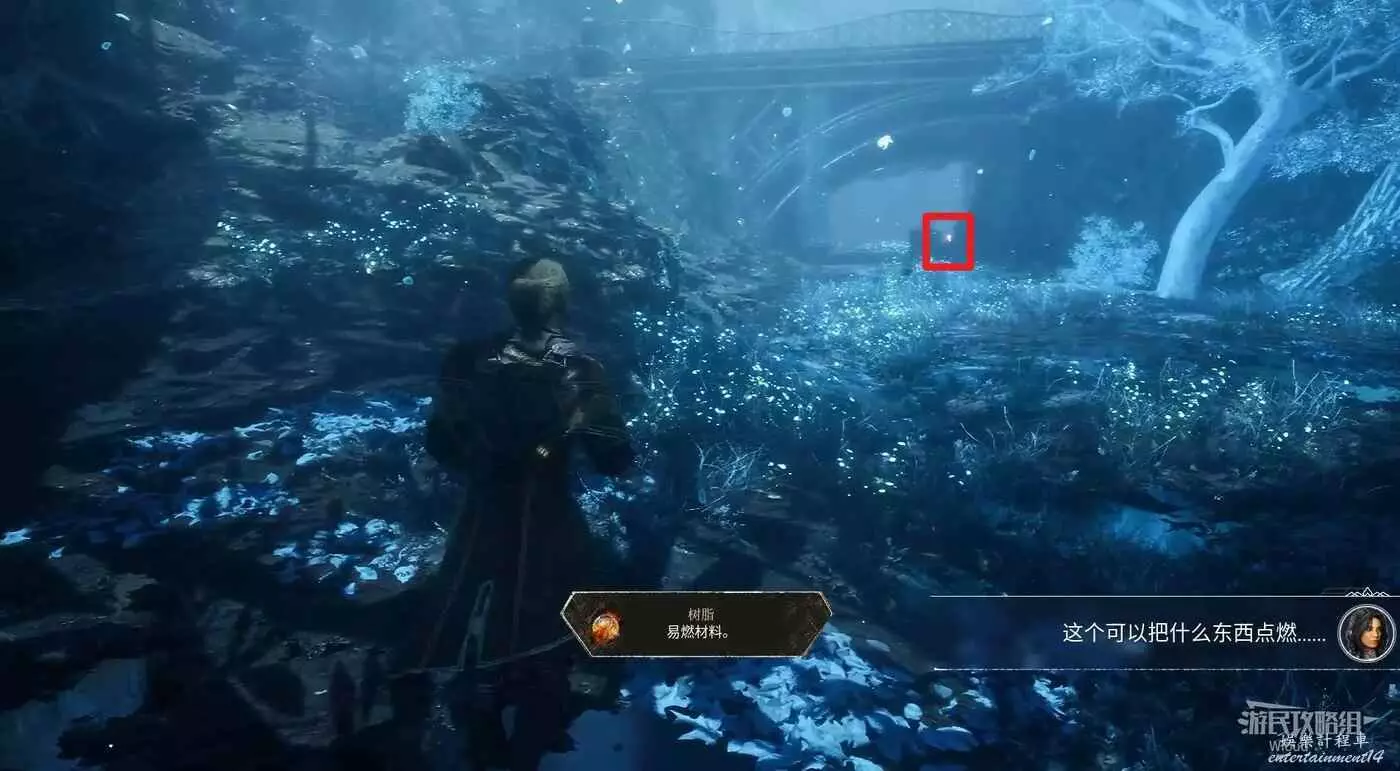 走過橋樑,往下走的時候,對面有個亮點,靠近拾取重要道具【樹脂】。