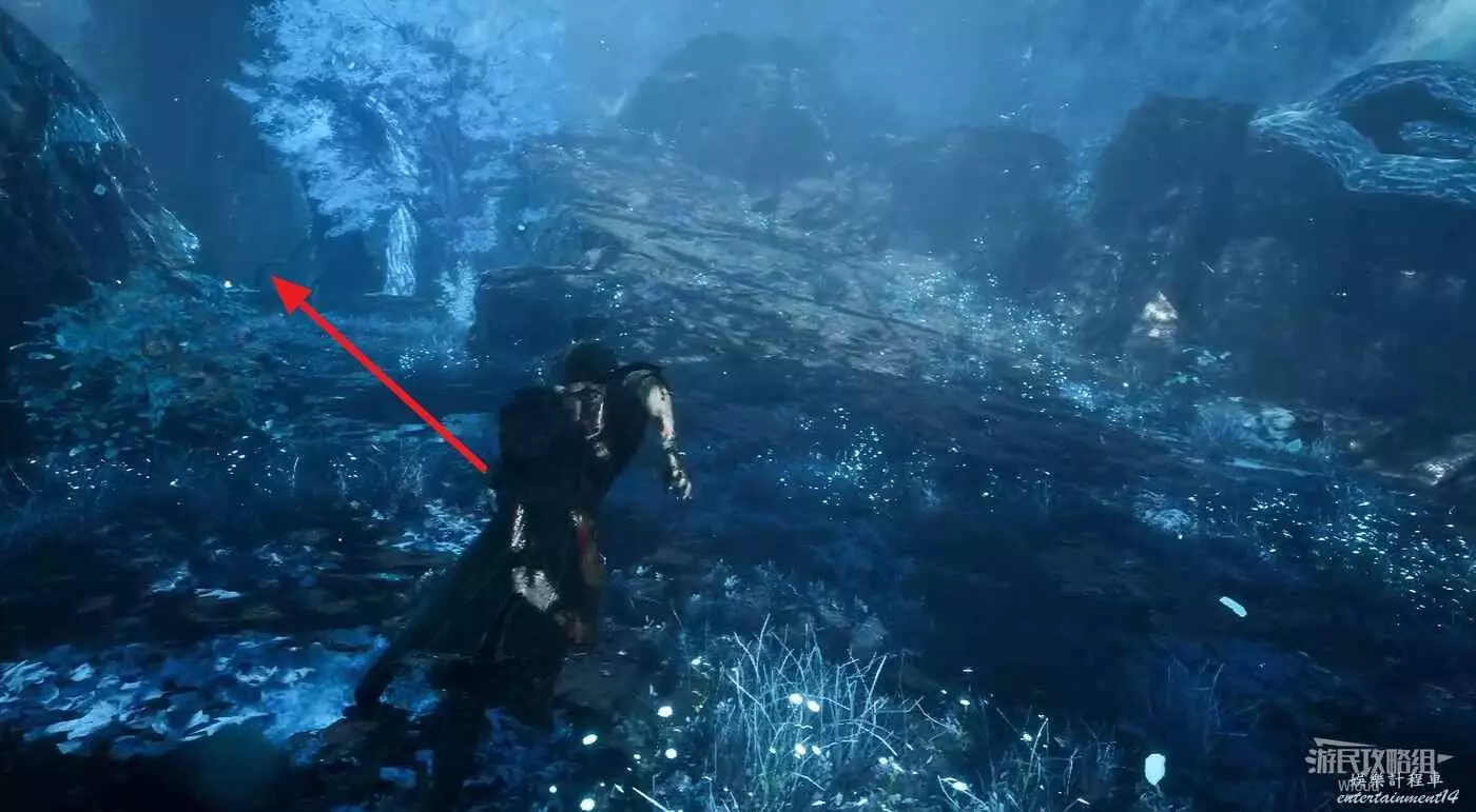 旁邊左側有個向上走的坡,我們走左側有藍樹的過道,裡面可撿個道具。