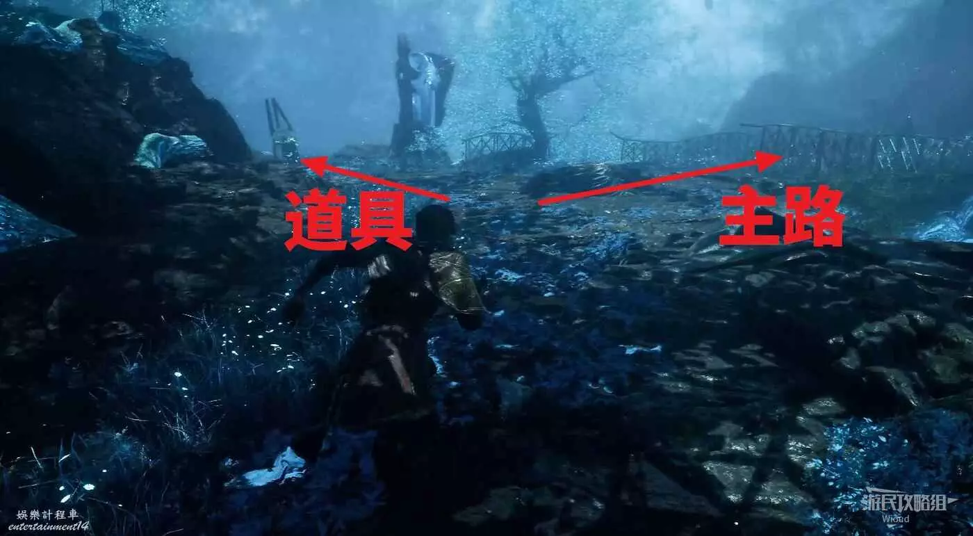 沿左側主路走,直到看到一個向右衍生的橋樑,擊敗左前方怪物,靠裡的位置有個道具可拿。