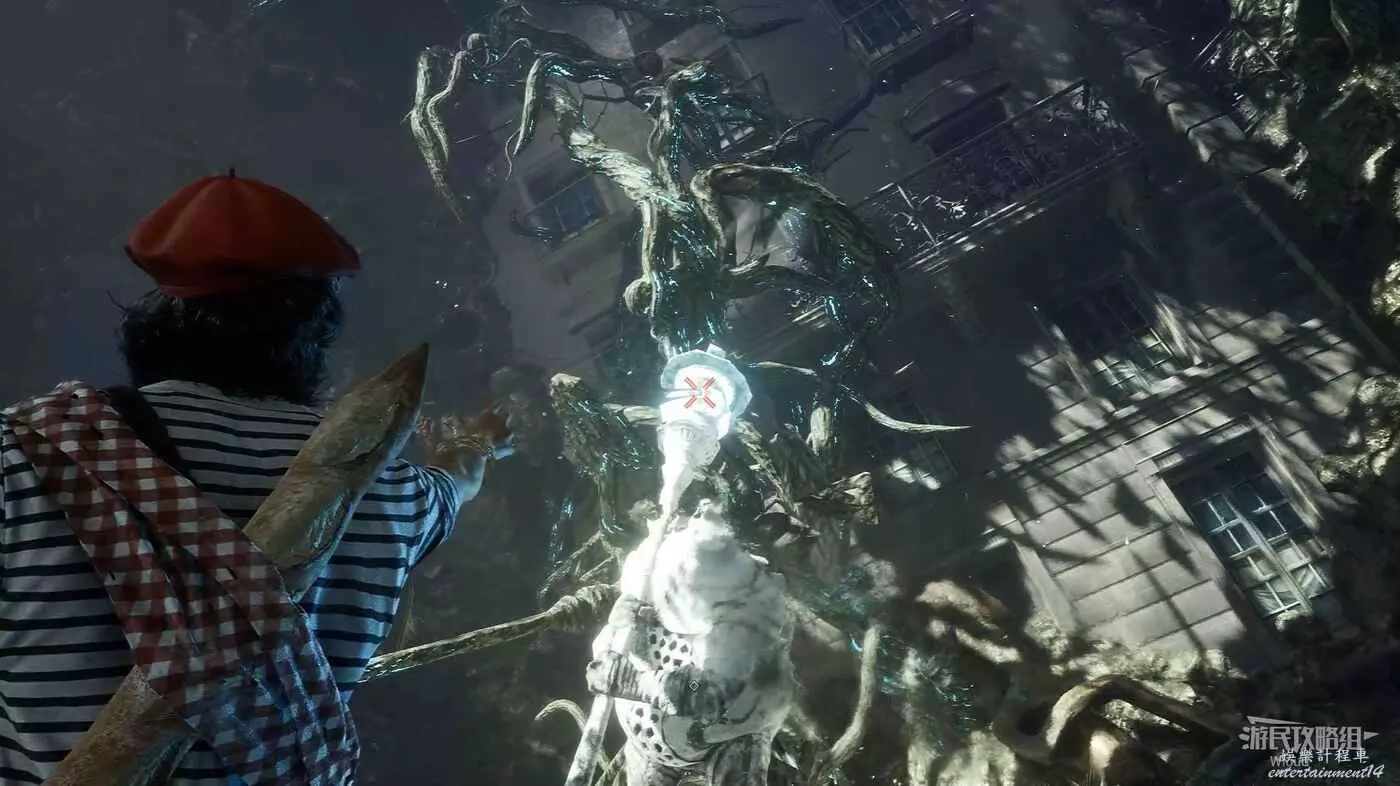 盡頭處抬頭可以看到一個鉤爪點,跳到對面平台走到頭可以找到本地圖的【默偶】,將其擊敗可獲得古斯塔夫的【法棍】裝束。