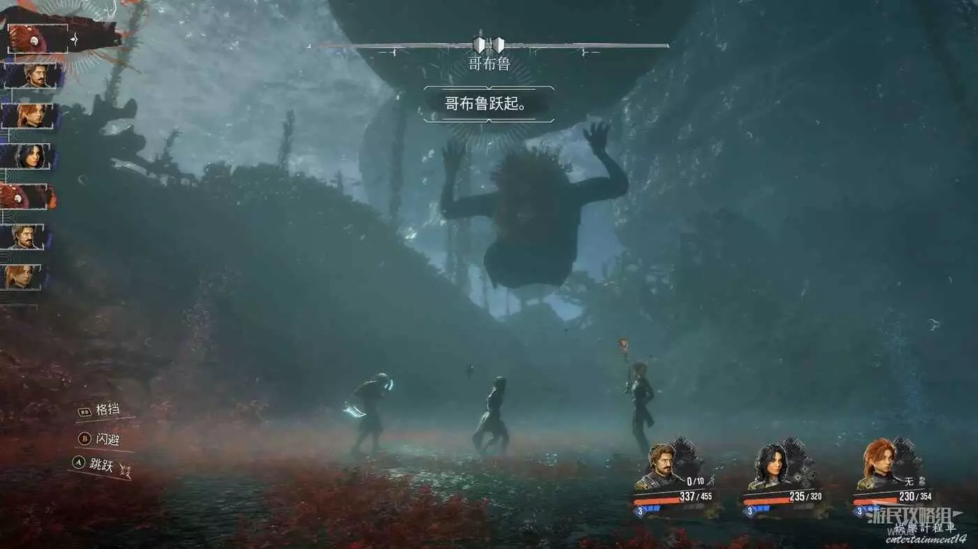 開局需要注意的時,當哥布魯跳動半空狠狠砸向地面時,是沒有跳躍攻擊的圖示的,因此此招是閃避躲避!