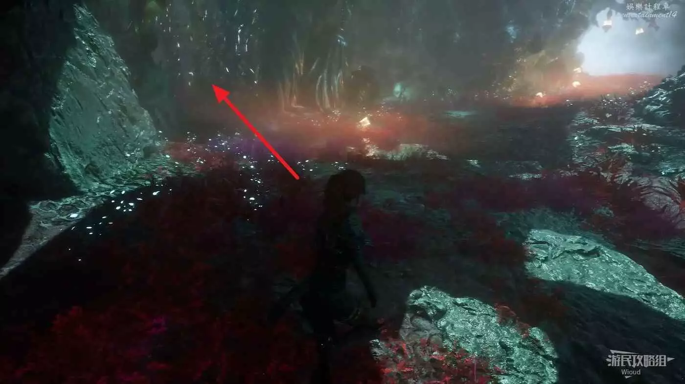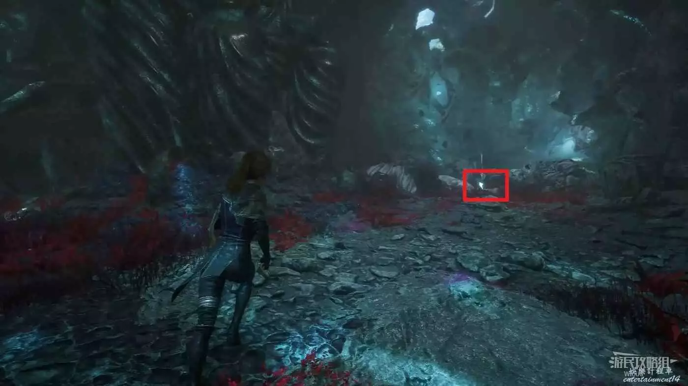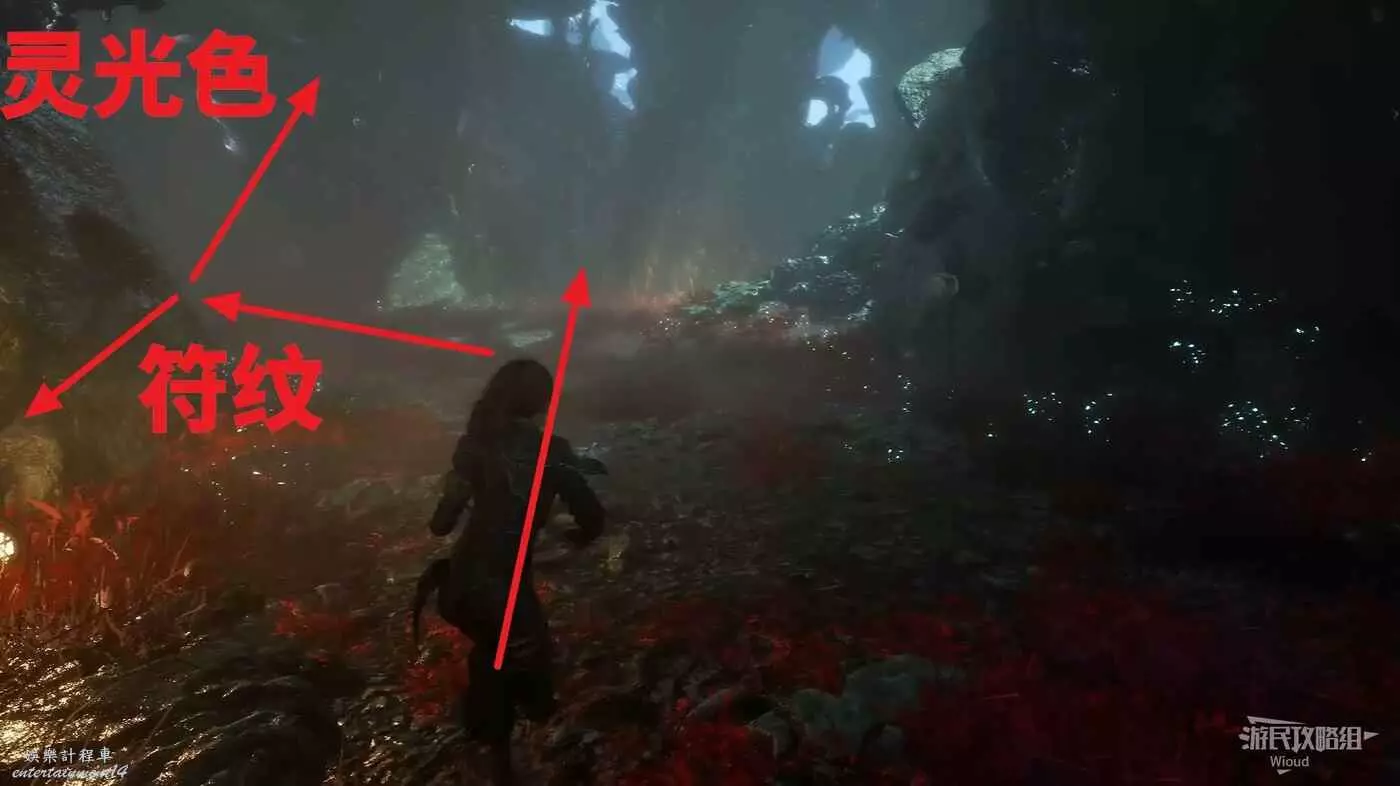 經過燈籠海藻樹,貼著左牆走到一個過道,走進去立即左拐,盡頭可以找到符紋【回報標記】,回到過道門口進去右拐可以拿到一個【靈光色】。