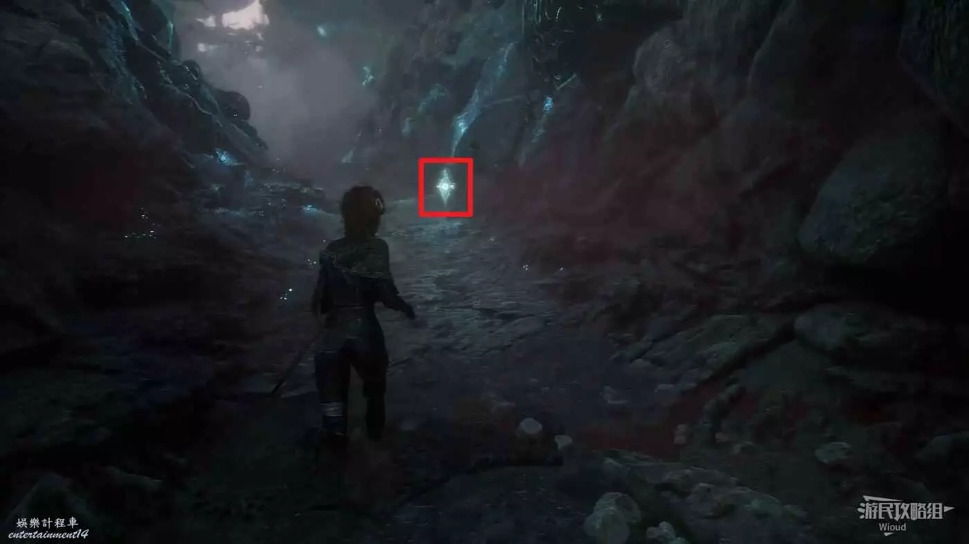 來到開闊區域,走到對面右拐進入散發黃光的隧道。
