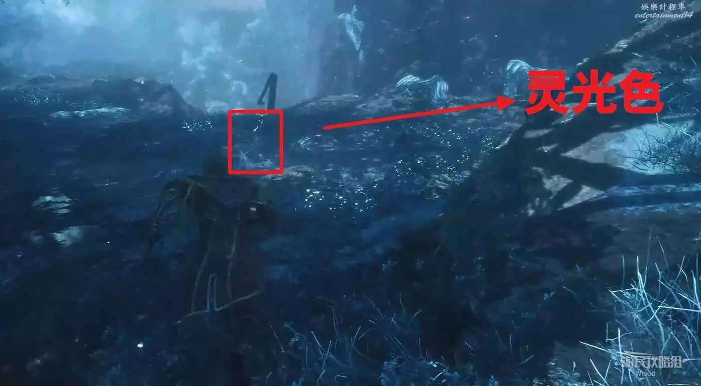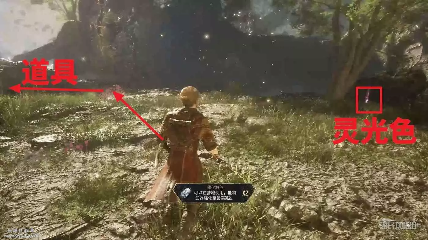 回到篝火處往右走,不遠處有個大塊頭敵人,敵人右側樹下可以撿到一個【靈光色】。