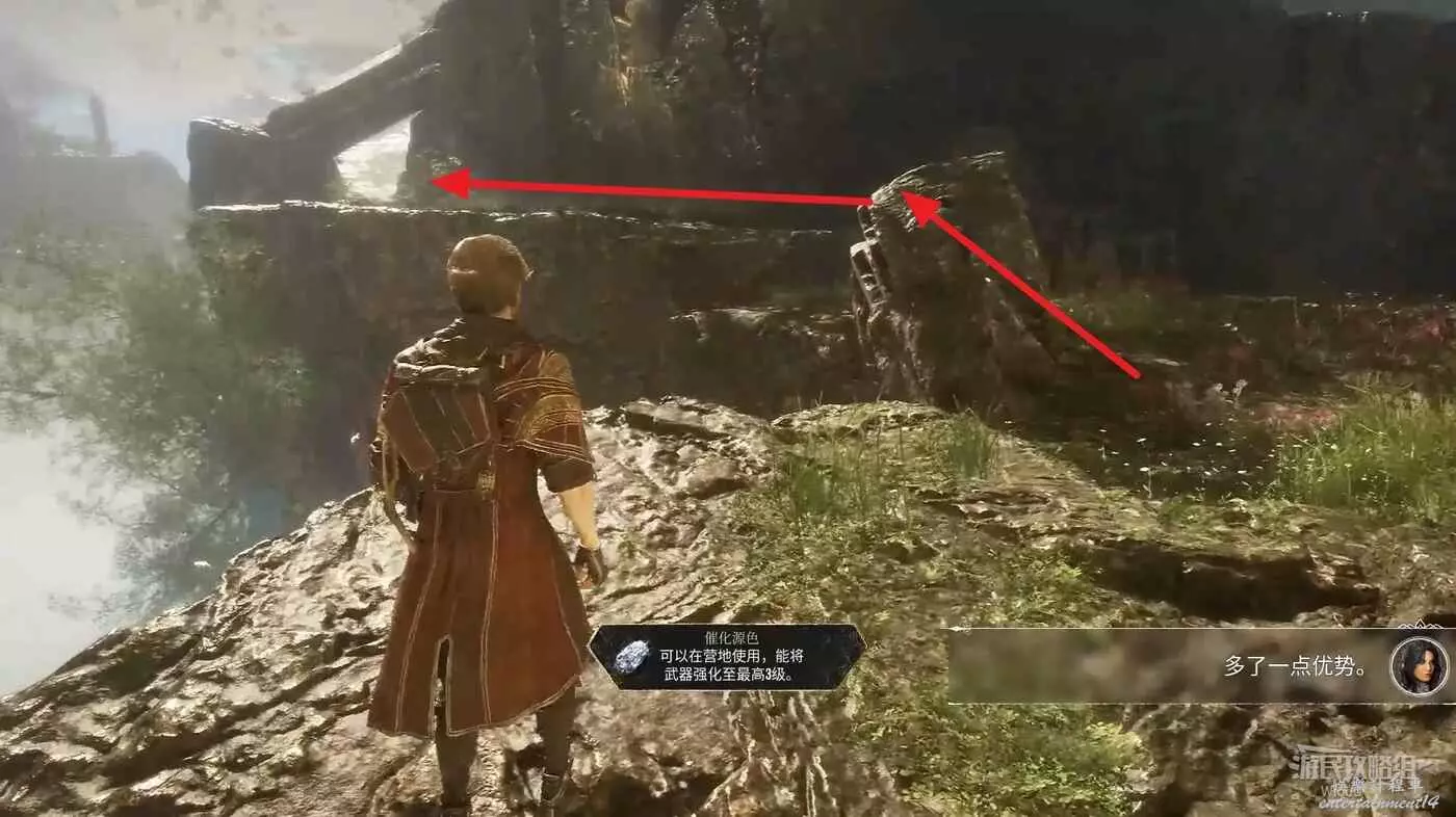 通過鉤爪移動到另一個地方,前方倆怪物右側平臺有源色可撿,怪物左側懸崖處有個可對話的NPC。
