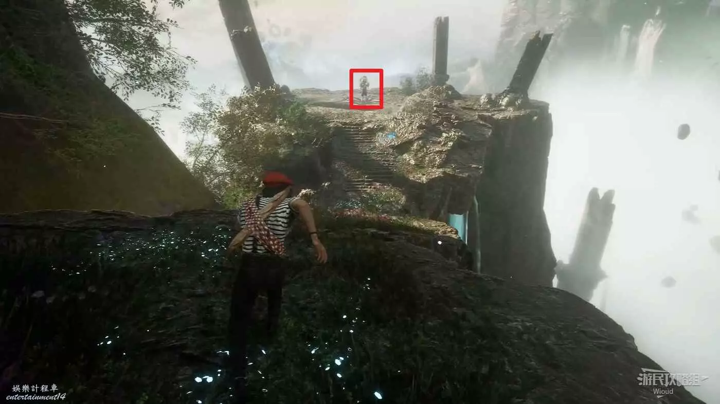 右側有個往下爬的梯子,直接無視,沿著下圖路線往左前方平臺上跳。