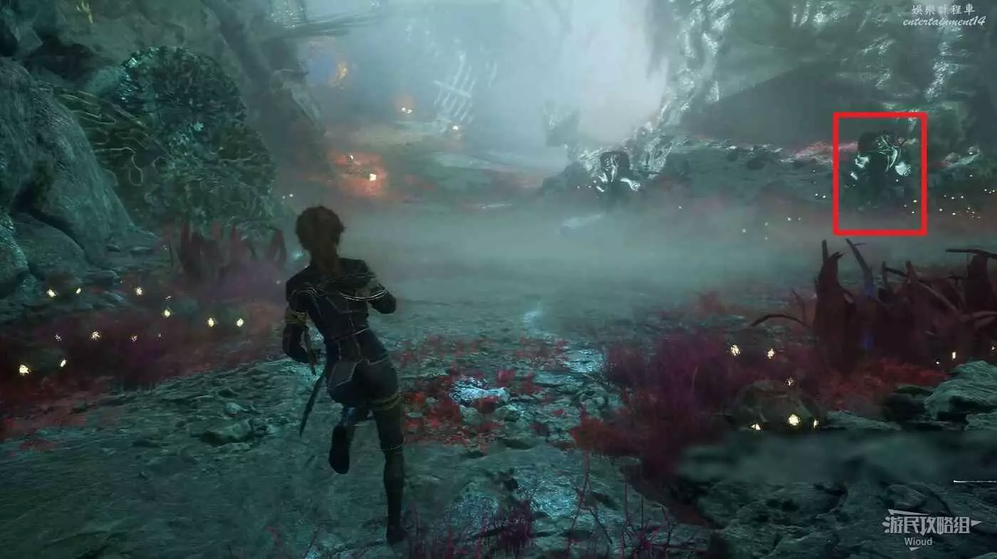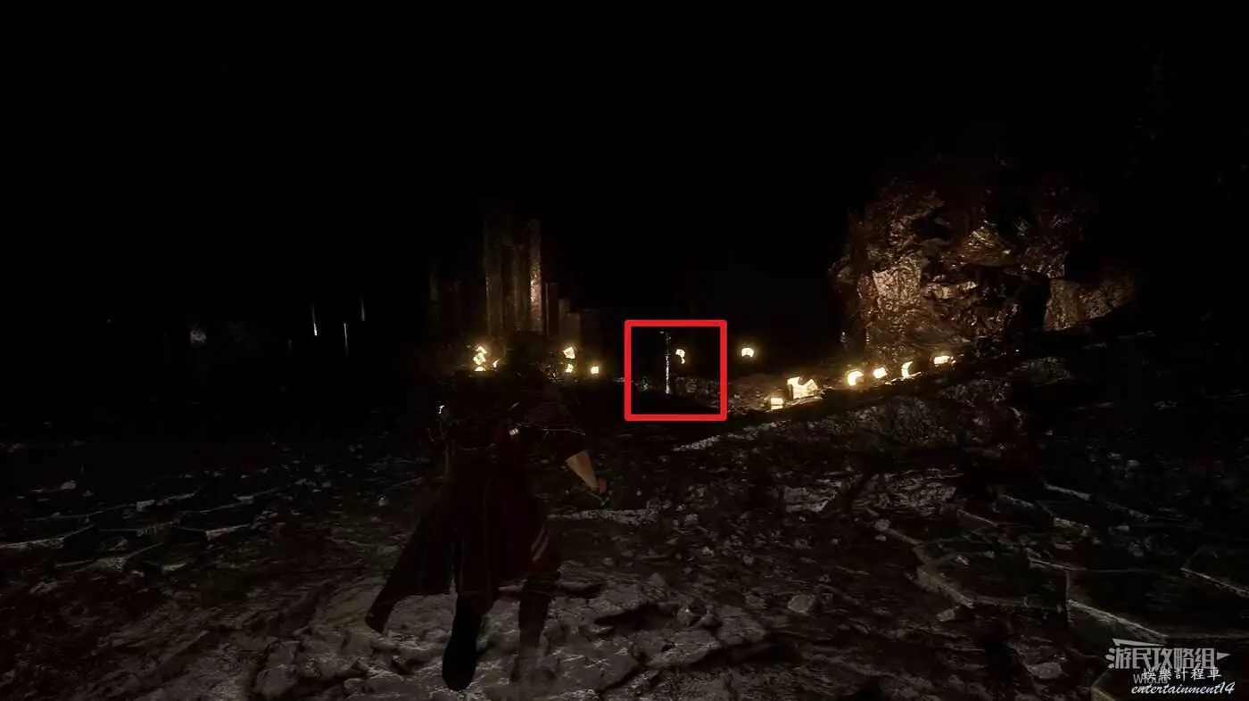 無視這隻經怪,啟動左側的篝火,沿旁邊的藍色通道走到裡面的開闊區域。