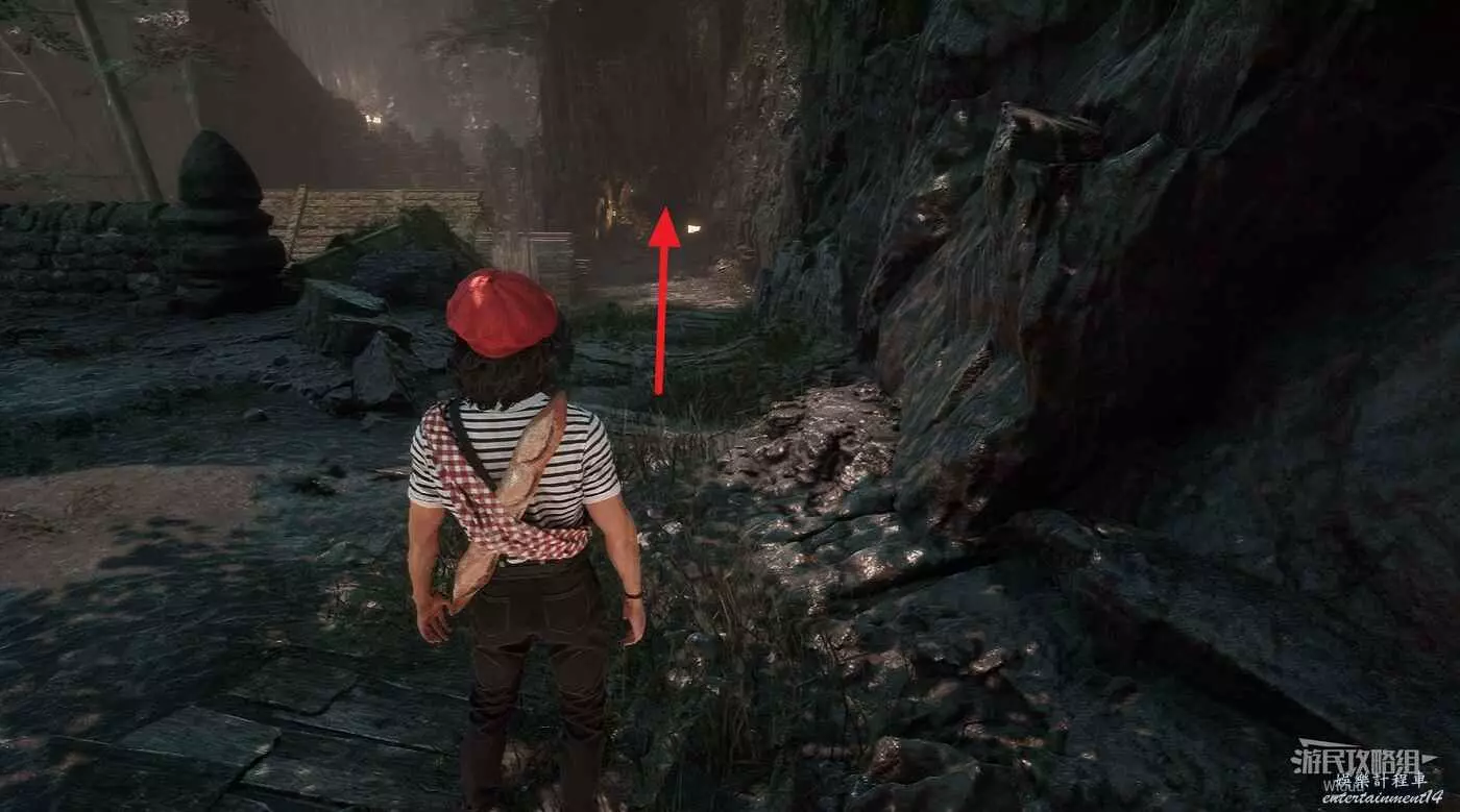走到對面柵欄缺口但不要出去,院子裡往右繞進入穿過前方洞口。