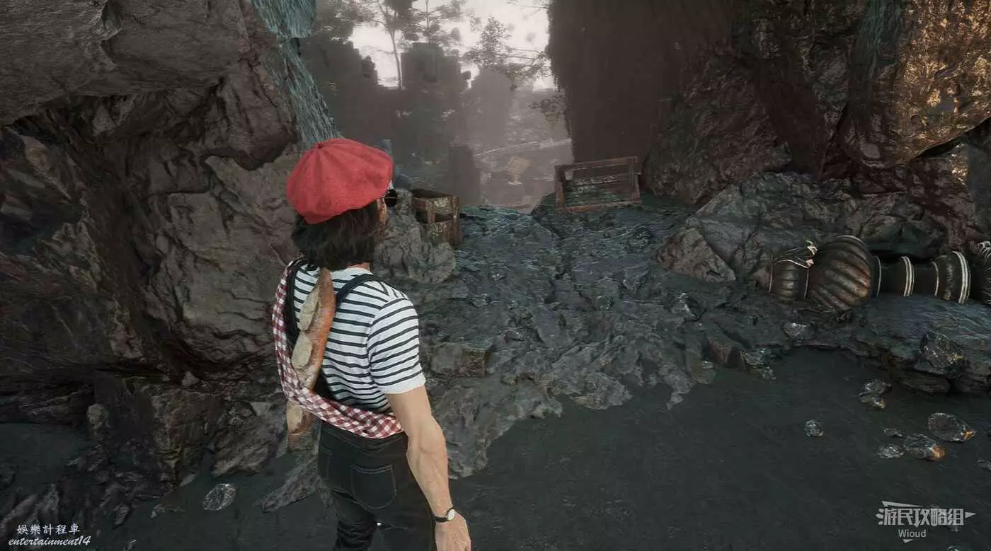 盡頭處抬頭可以看到一個鉤爪點,跳到對面平台走到頭可以找到本地圖的【默偶】,將其擊敗可獲得古斯塔夫的【法棍】裝束。