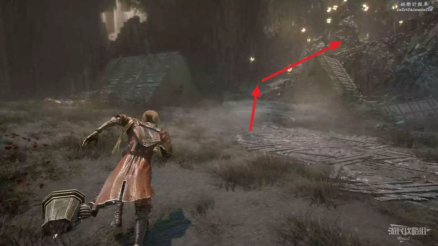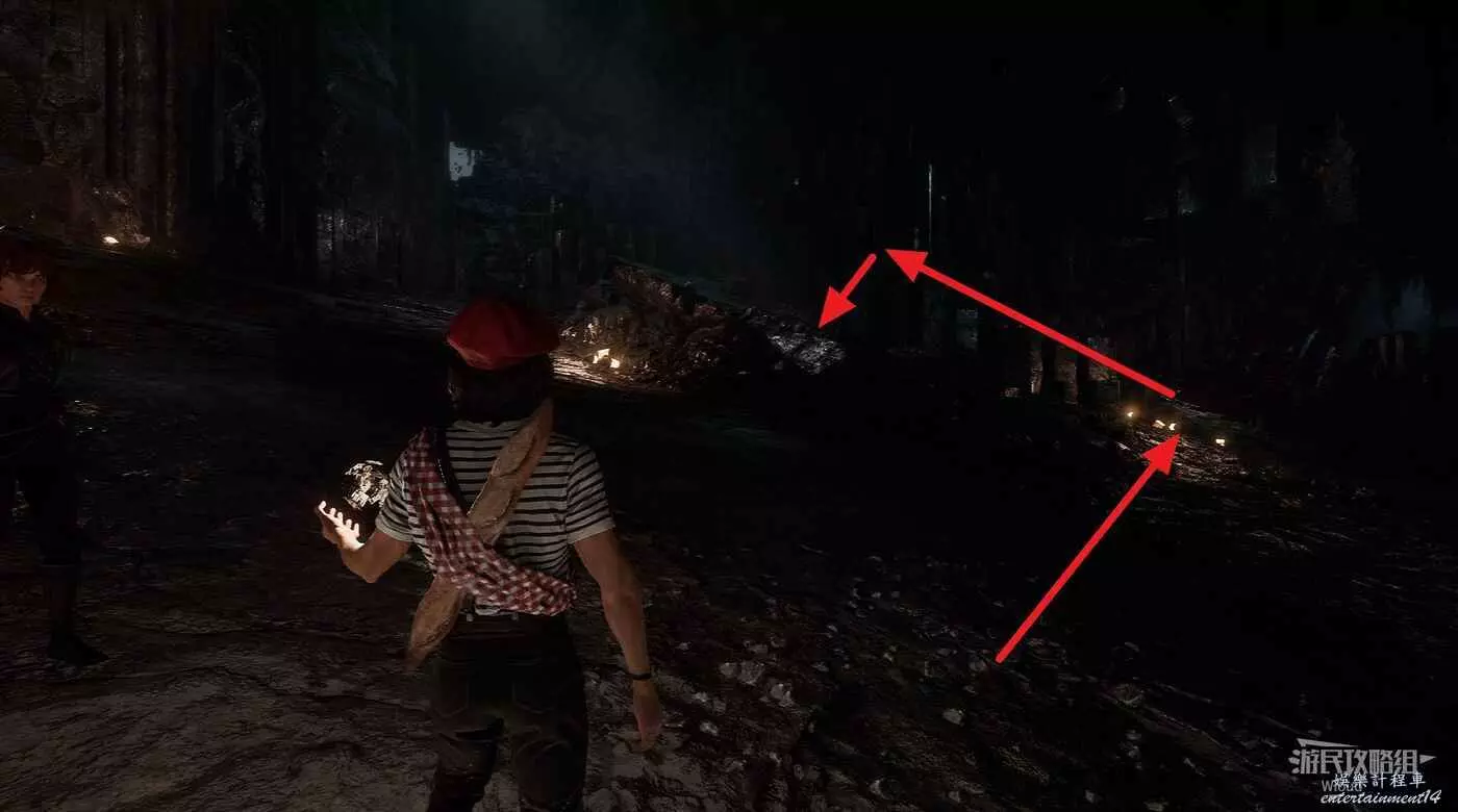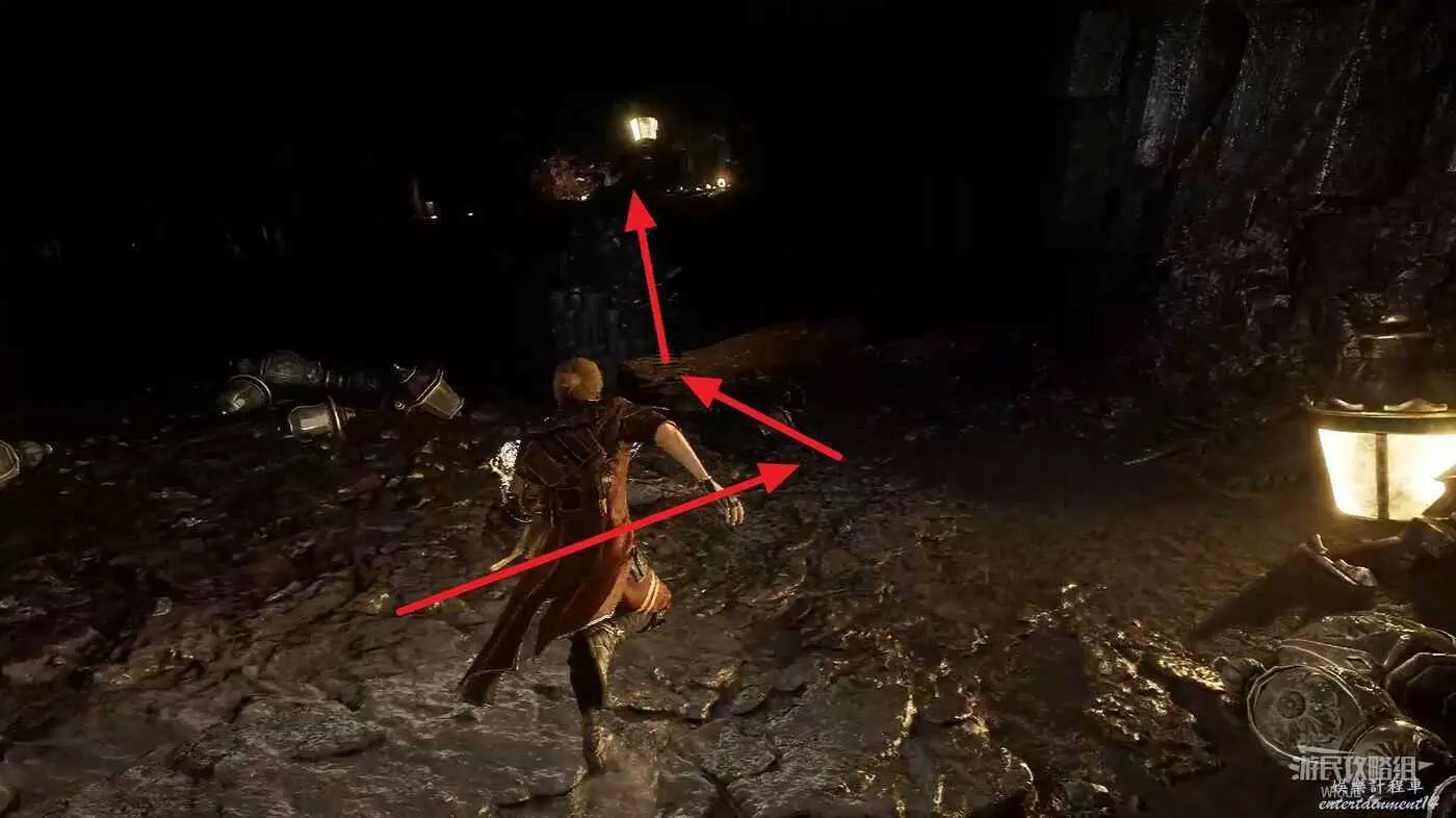 盡頭洞穴,擊敗帶著提燈的精英怪可獲得符紋【振奮著火】,繩索位置直走左拐可撿到一個強化道具,中間柱子右側可找到本地圖宅邸入口,入口左側桌子上也有道具可撿。