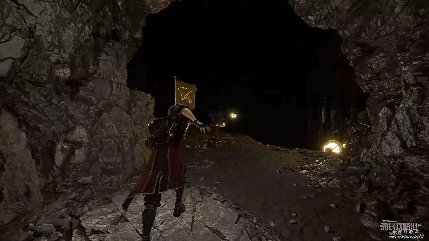與左側角落的石頭經怪對話,接取一個尋找發光石頭的任務,隨即往右走,進入洞穴找到下一個旗幟。