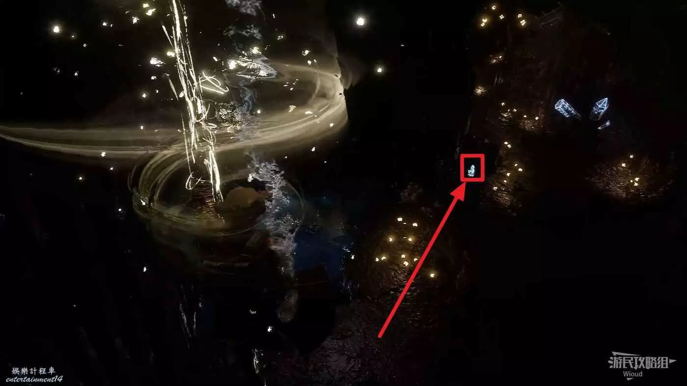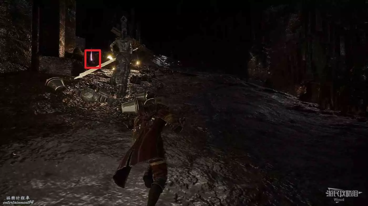 走出通道先往右走,右側盡頭有個被木桶擋住的光點,破壞木桶拾取光點獲得符紋【死亡精力·二】。