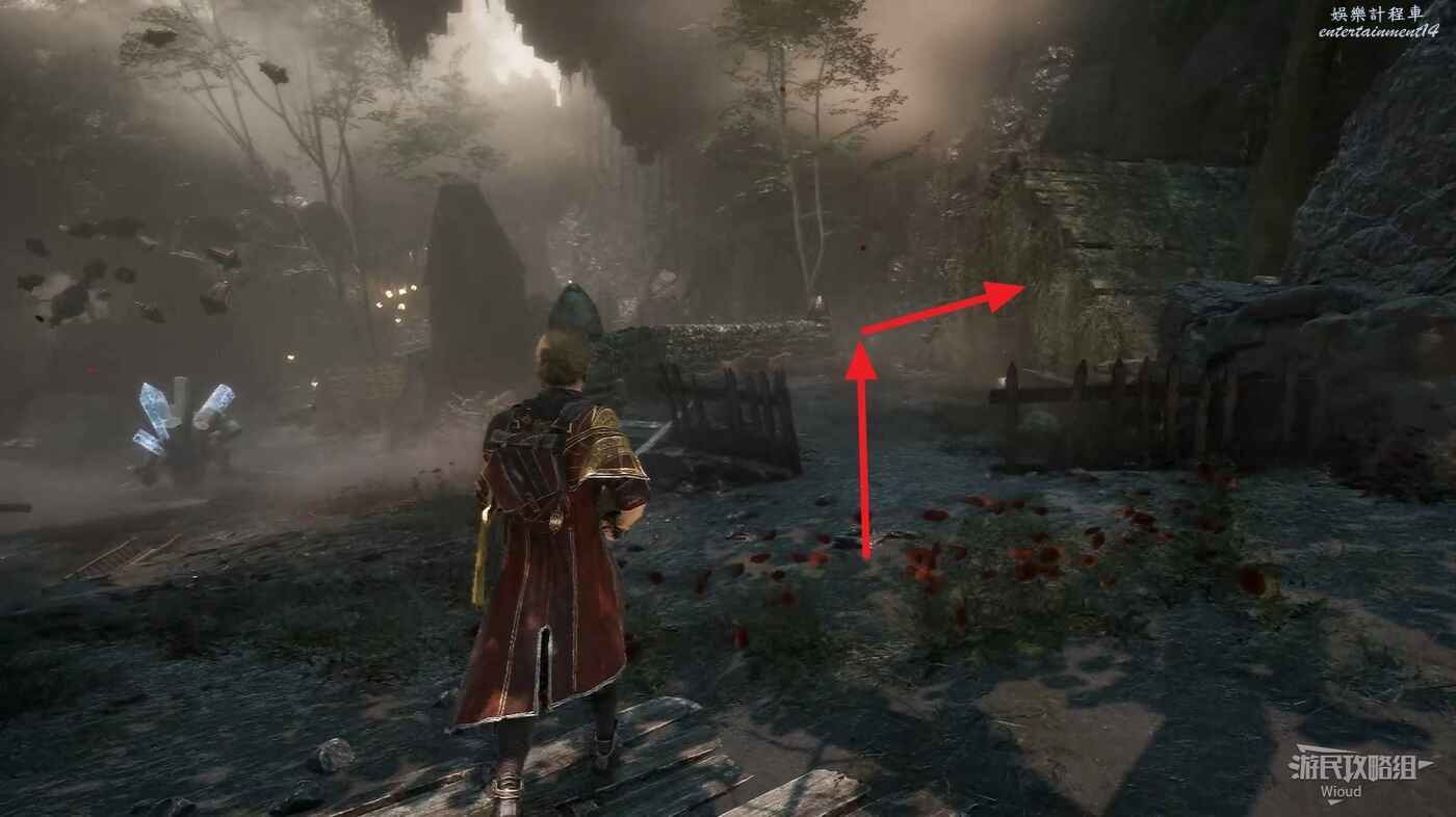 從宅邸大門出去,回到第一塊石晶的位置,此處先不管左側岔路口,走右側大路,移動時注意左側直到看見一個上坡。