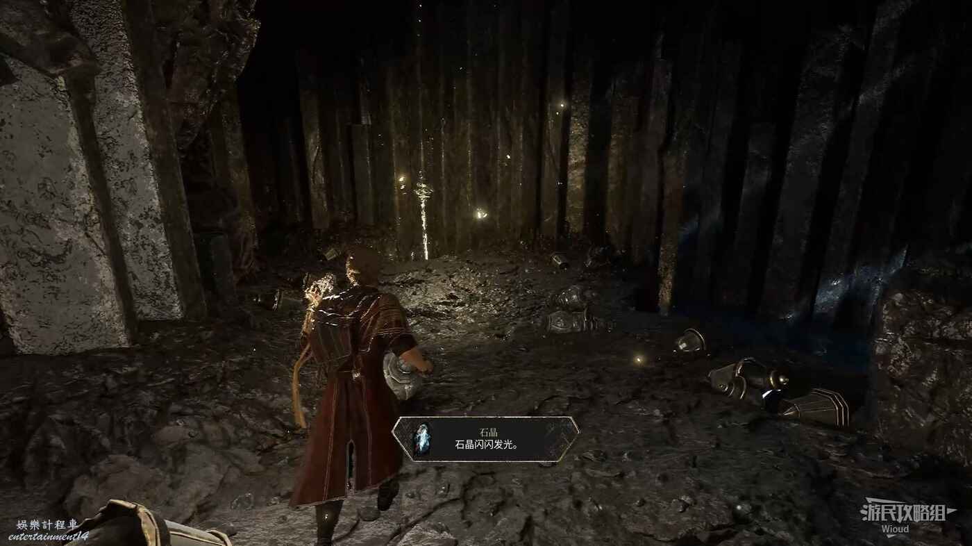 隧道左側可拿到一個【靈光色】,走到盡頭發現同樣散發藍色光芒的石晶,但這塊是怪物偽裝的,靠近就會觸發戰鬥,提前做好準備。