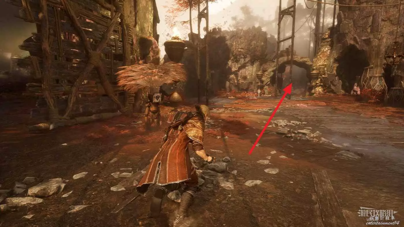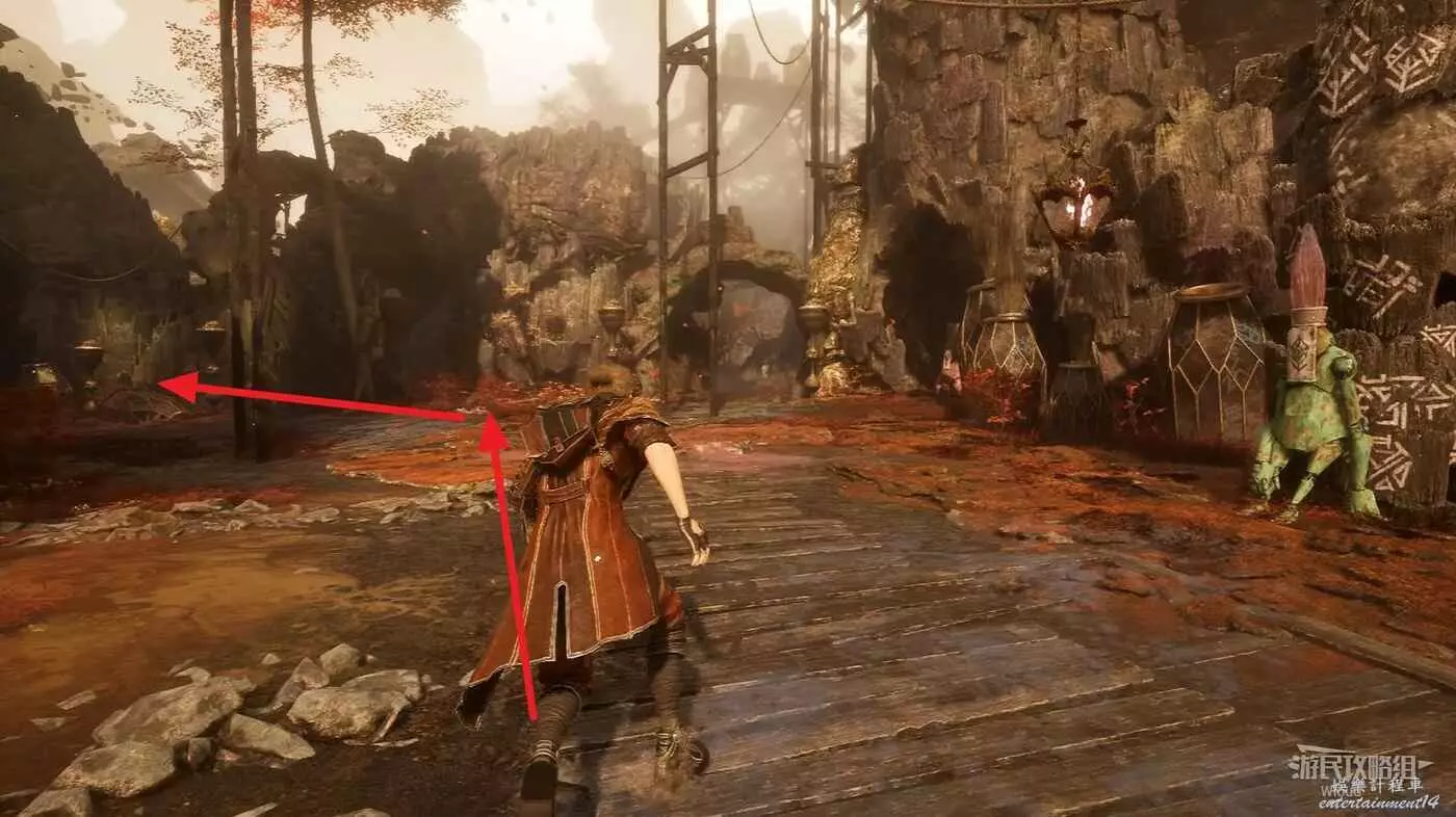 來到刷頭村女王房屋入口,右拐後立刻左拐,道路右側有個瘦高刷頭精,其身後附近可以找到個靈光色。