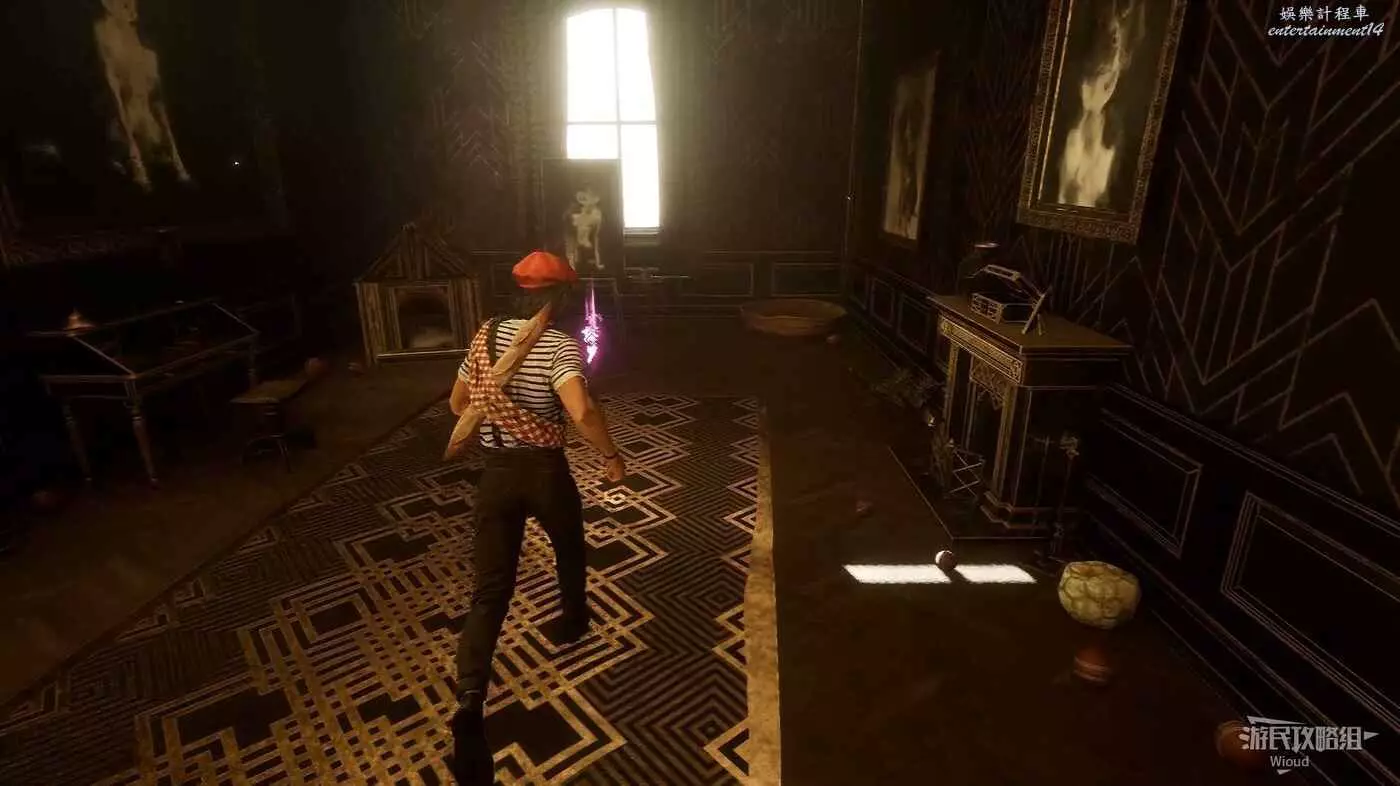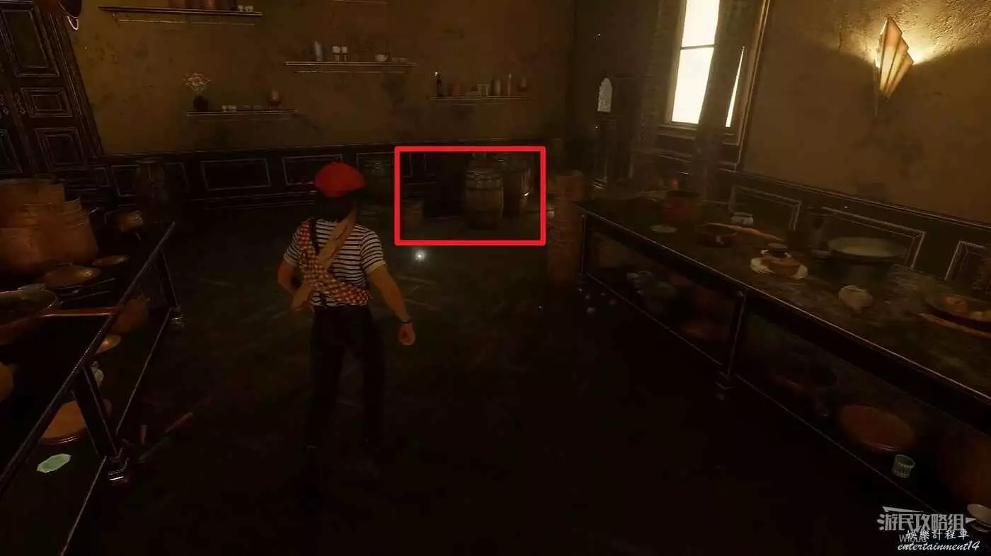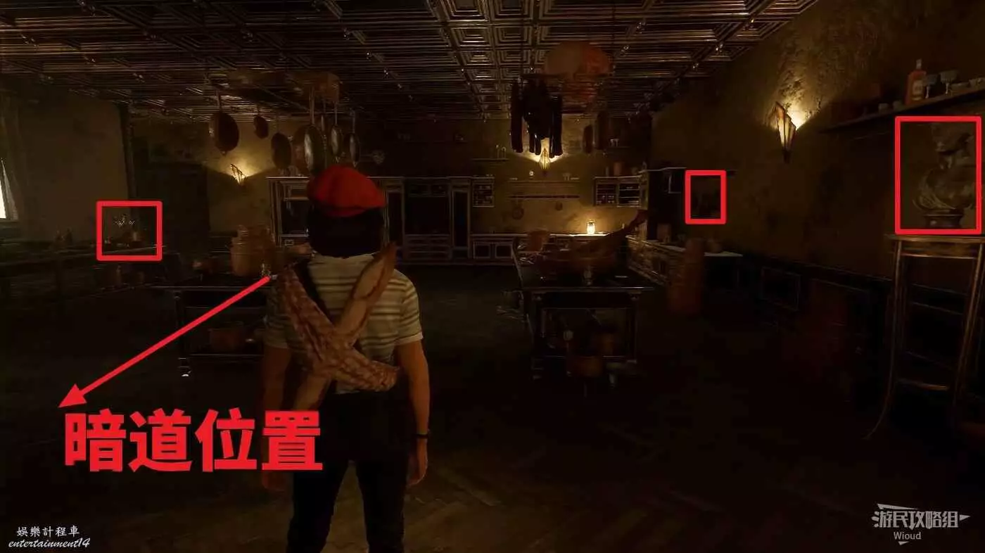 進入宅邸,傳送到一個房間,與入口右側的雕像,右牆靠前位置的平底鍋,和左側桌子上的機關互動,開啟房間入口左側角落的暗道。