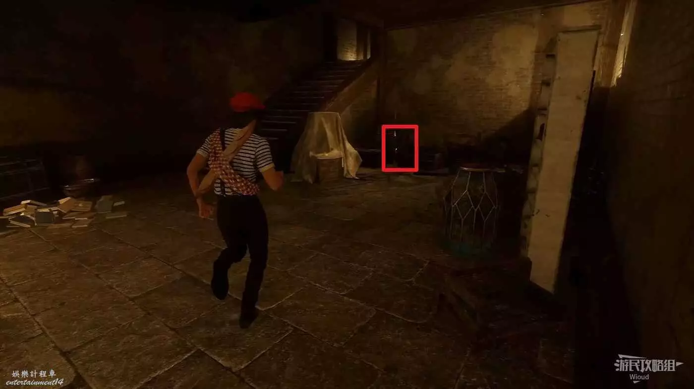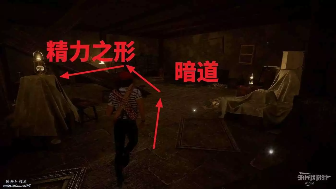 進入暗道房間,從左側的缺口來到一個樓梯間,樓梯右側箱子處可以撿到道具【精力之形】,樓梯口正對面可以找到下一個暗道入口。