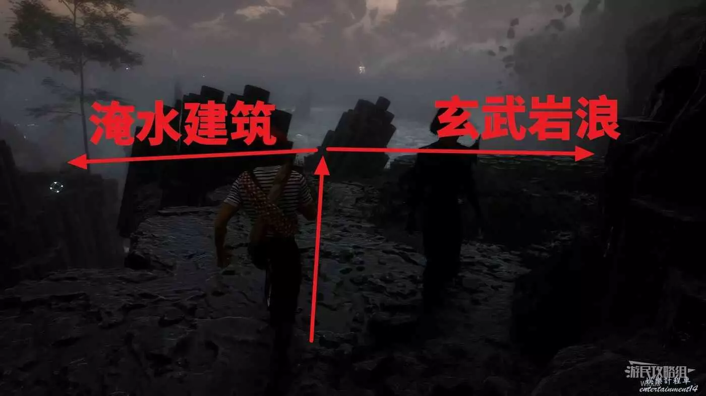 沿著下坡一直走,穿過第二個鉤爪點進入底部右側的房屋內啟動旗幟【淹水建築】,進入旗幟旁的小門往下走。