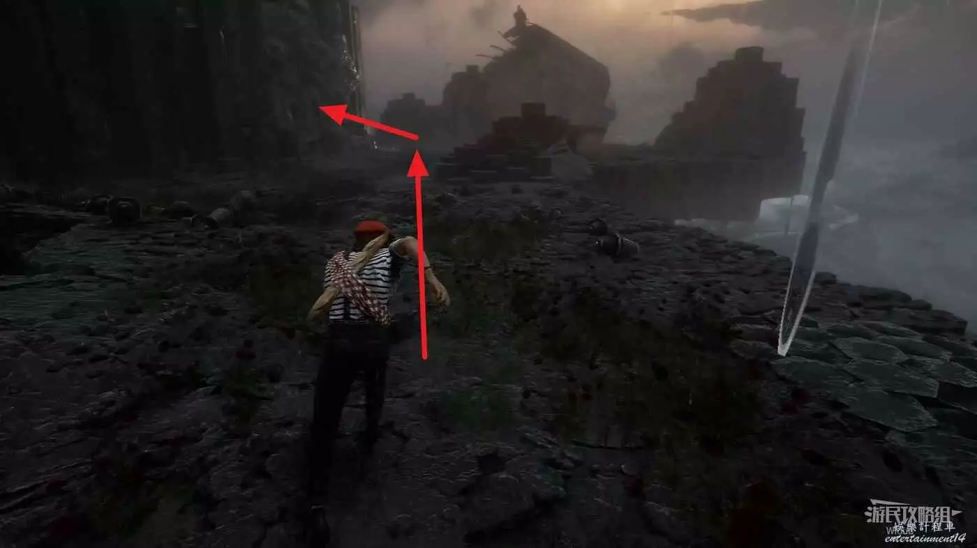 左側通過鉤爪跳過去可撿到符紋【衰弱標記】。
