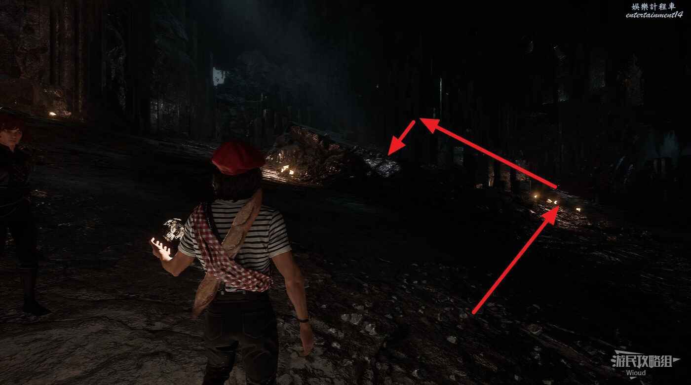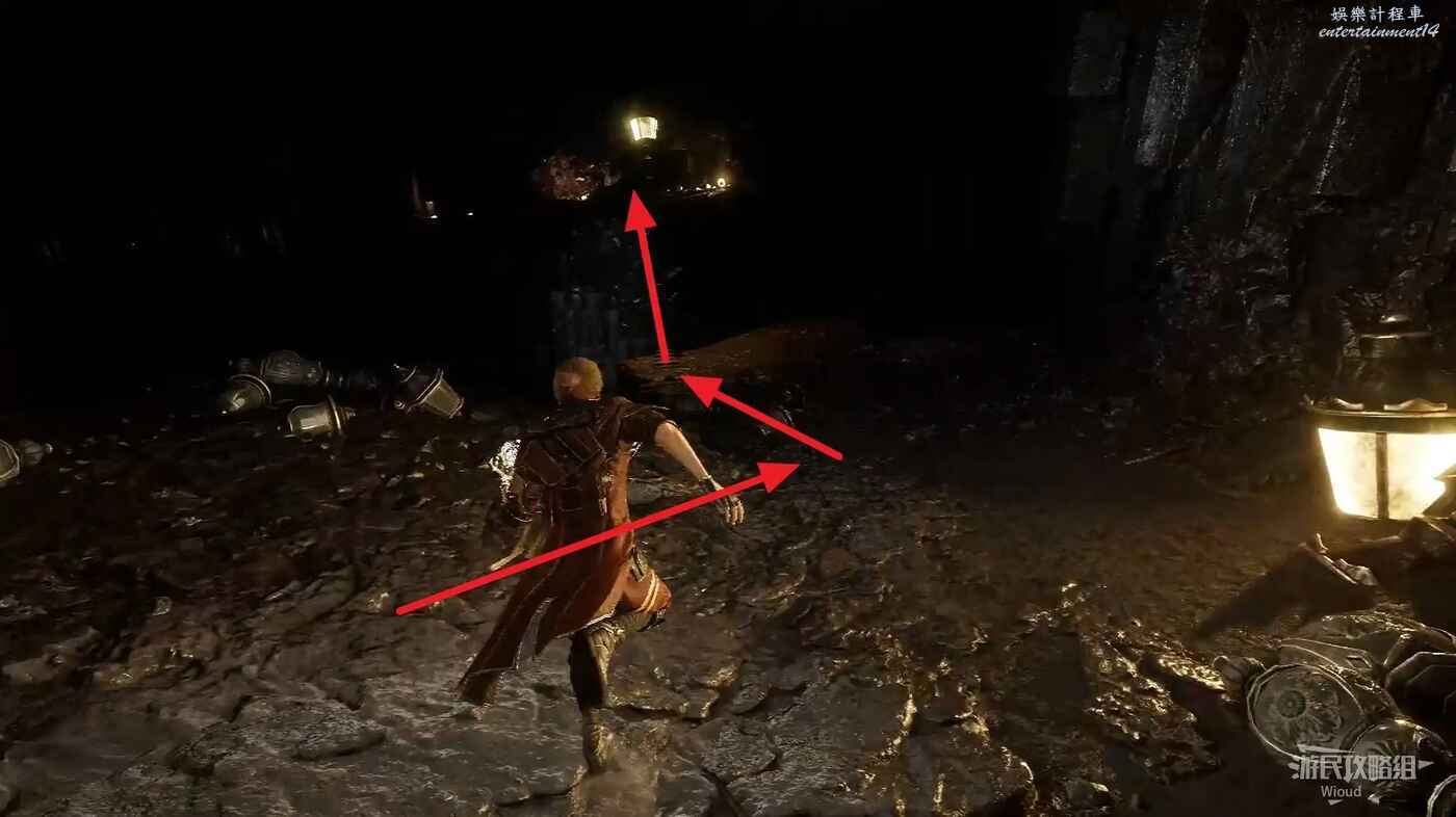 旗幟位置,沿著右側下坡走,路燈位置通過鉤爪跳到對面平台,往左走通過盡頭的繩索下去。