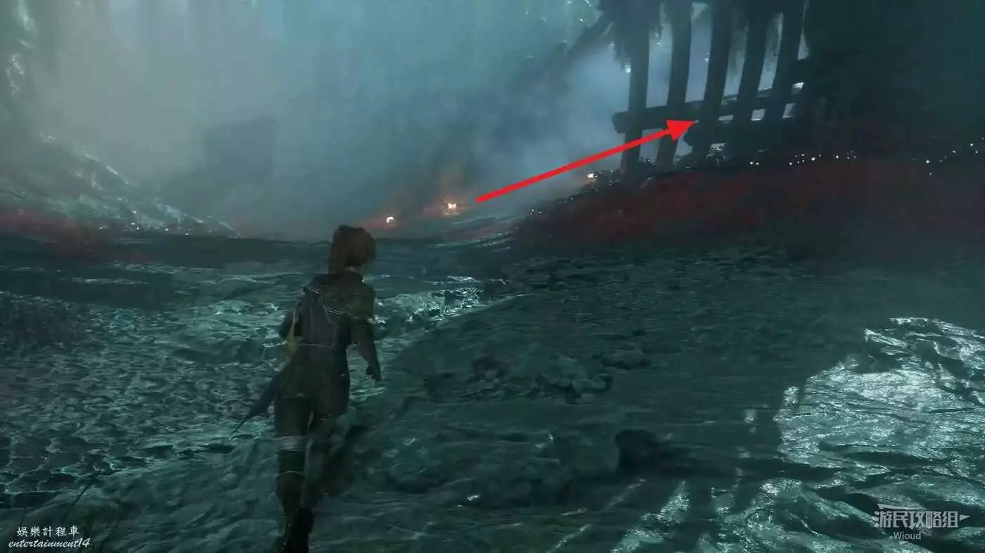 跳下去轉頭背對梯子往左走,通過鉤爪移動到對面平台往右走,經過第一個梯子找到地圖第二個繪籠。