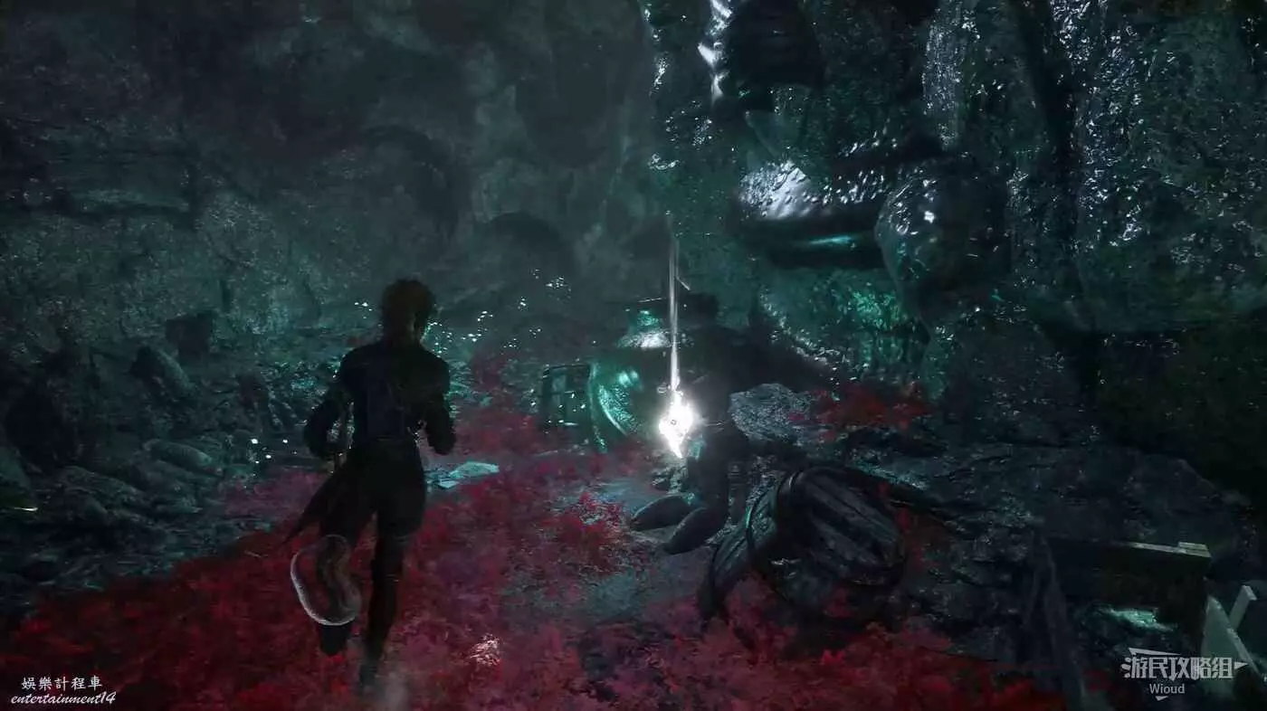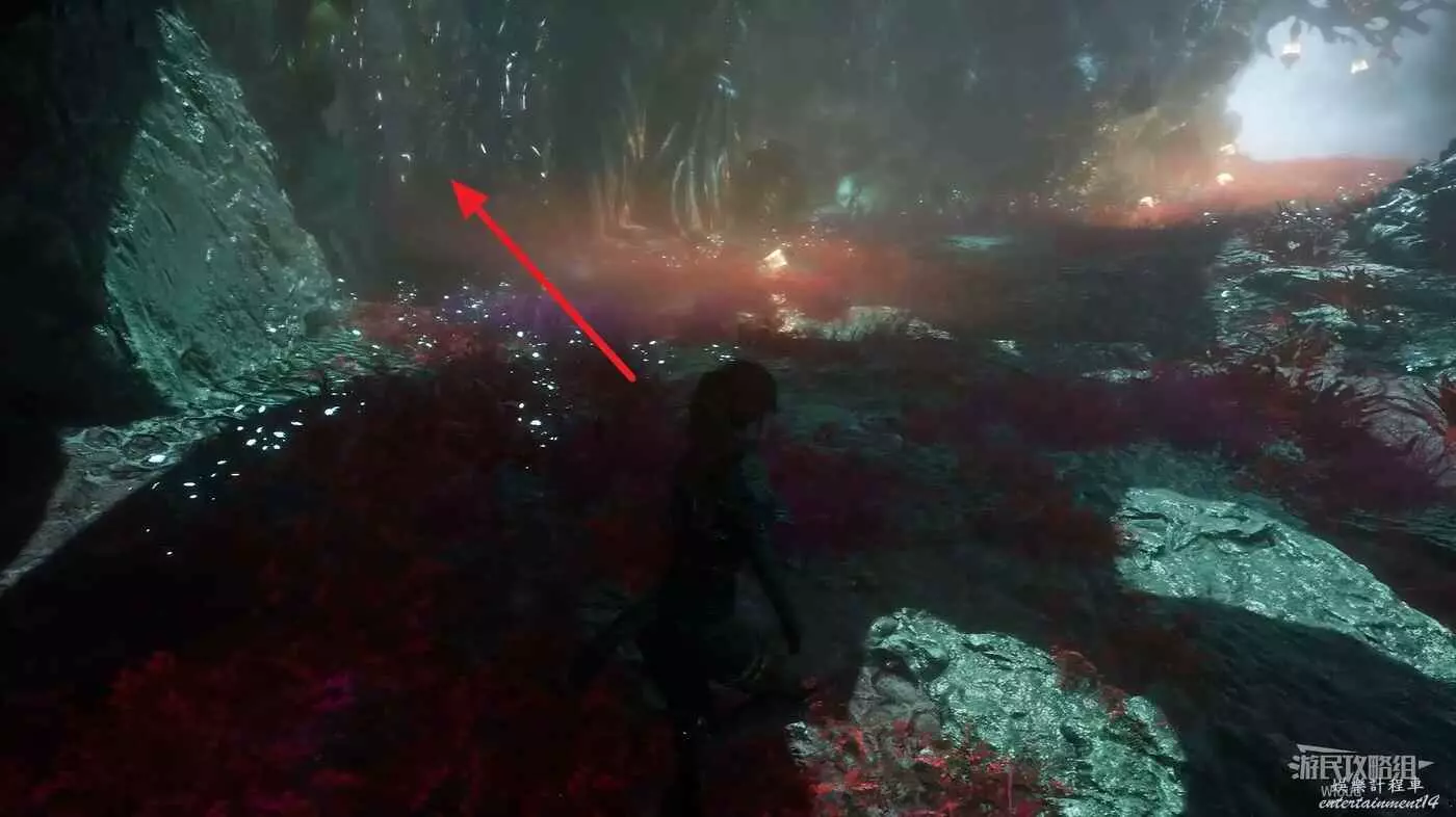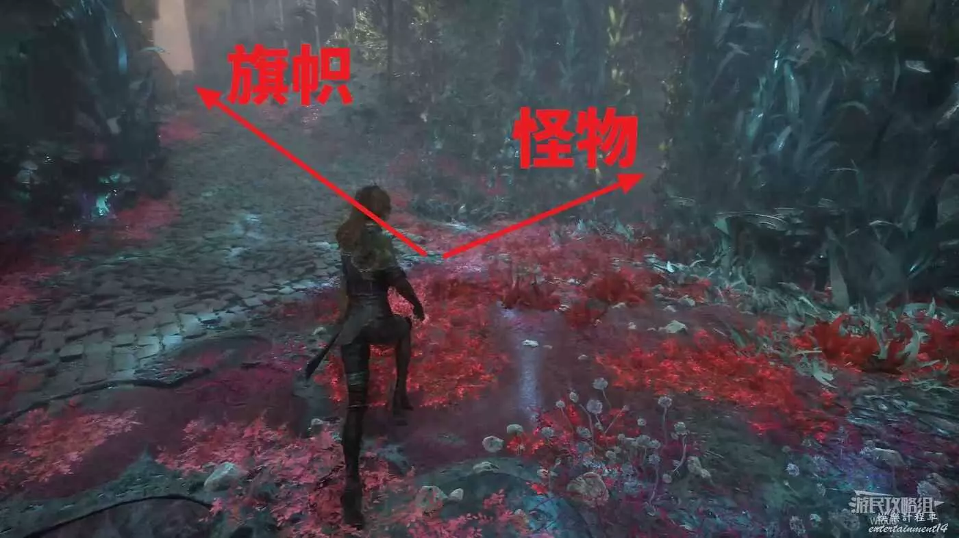 回到路口往右走,爬梯子上去,前進時注意找右側一個全是水藻的過道入口,找到後不著急進去,先直走啟動前方的遠征隊旗幟,再回來進入右側過道。