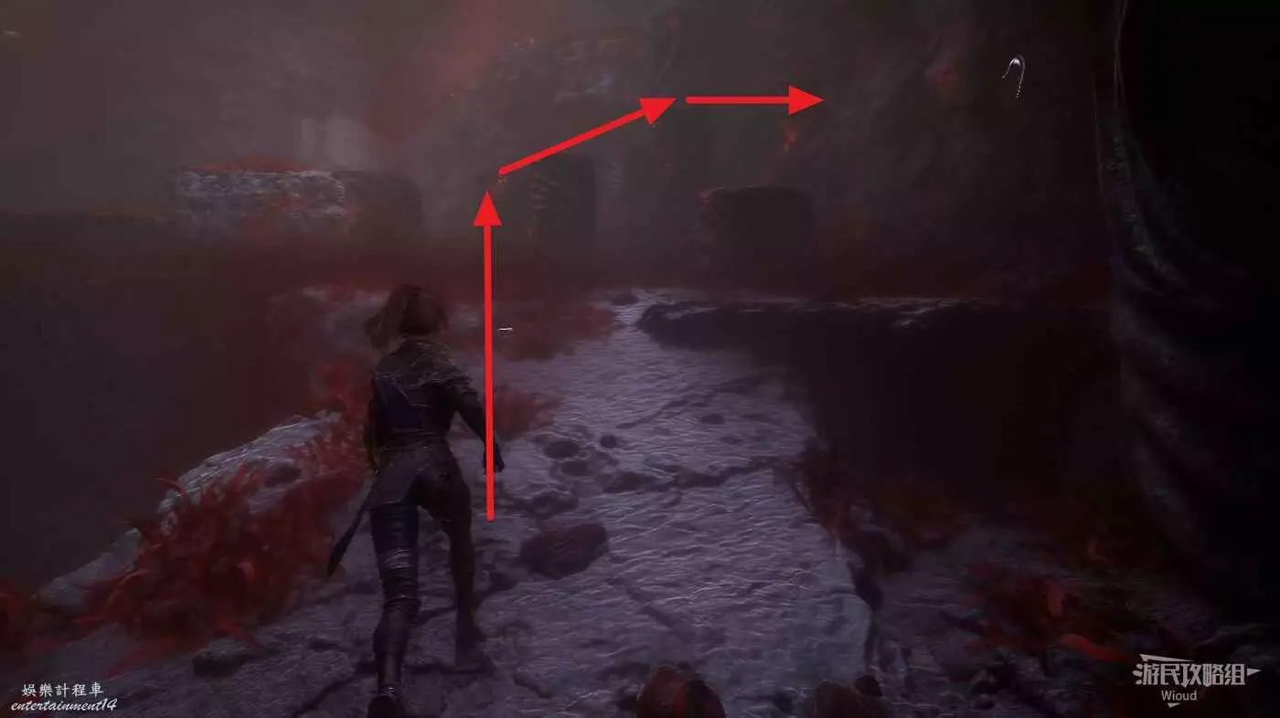 右側有個往下爬的梯子,直接無視,沿著下圖路線往左前方平台上跳。