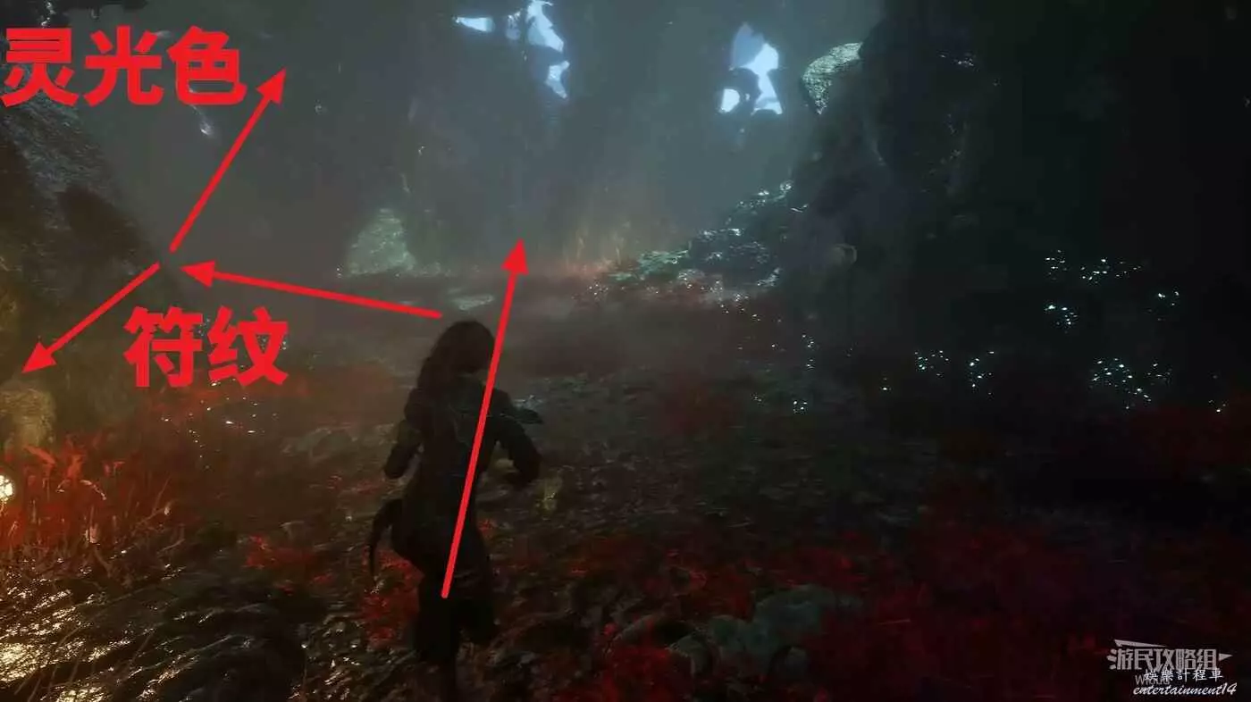 經過燈籠海藻樹,貼著左牆走到一個過道,走進去立即左拐,盡頭可以找到符紋【回報標記】,回到過道門口進去右拐可以拿到一個【靈光色】。